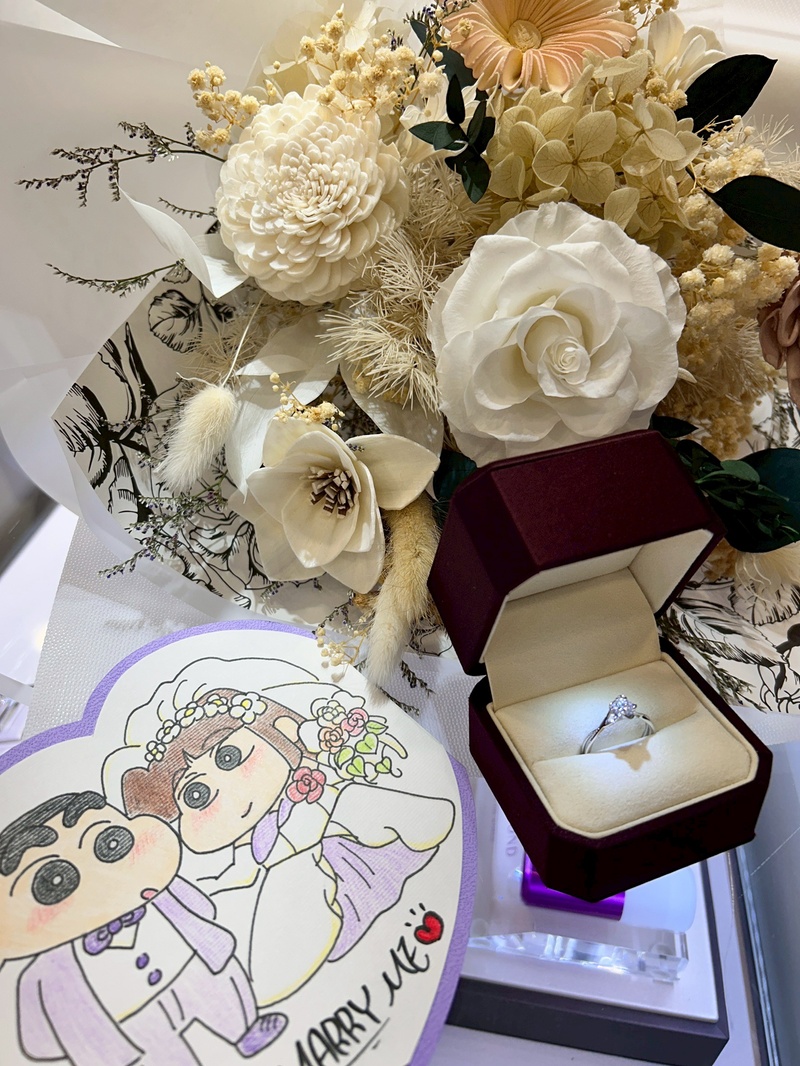 除了求婚佈景和求婚花束外,店員雯琦還協助不會畫畫的先生畫出我最喜歡的蠟筆小新~超感動,身為I人的我,店員們也很貼心的躲在布簾後,不打擾我們的求婚現場,最後求婚成功,可喜可賀^^