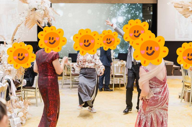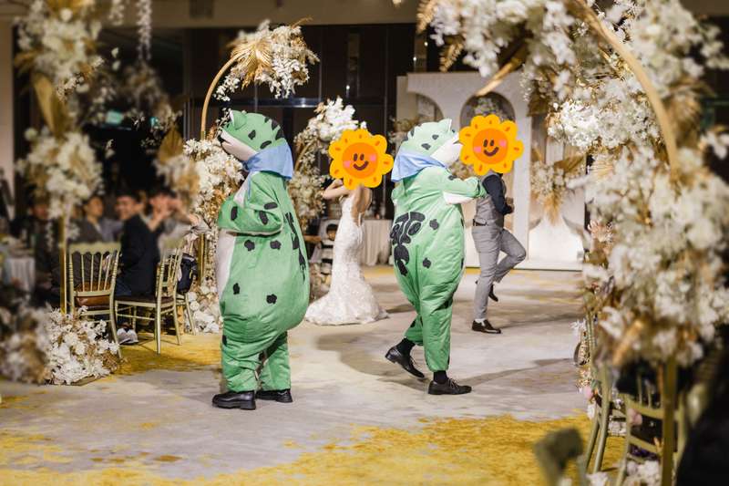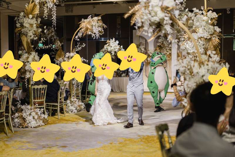 我們有租借卡拉OK、聚寶盆抽獎、迎賓小點心、簽到撲克牌,另外還有速寫畫家讓賓客閒暇時間有事情做,移除抽捧花只留逐桌敬酒的環節。