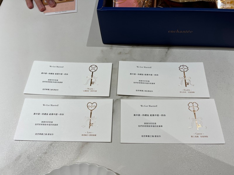 樂朗奇還有一個小巧思,就是每盒喜餅裡都會附上一張隨機的祝福小卡,聽說有「健康」、「愛情」、「工作」、「幸運」等四種,覺得這設計挺有趣的,賓客還聊聊自己拿到哪張小卡,感覺增加了互動和話題性。