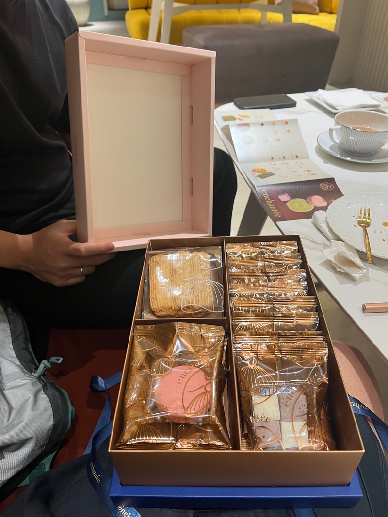先講一下仁愛門市的環境,一走進去就覺得空間好舒服,擺設很有質感,家具風格帶有優雅法式風請,我很喜歡店裡一進門右側的禮盒展示牆,禮盒款式一目瞭然,而且拍起來很漂亮。接待我們的是Coco,笑起來有可愛的小虎牙,態度親切,介紹也很仔細。