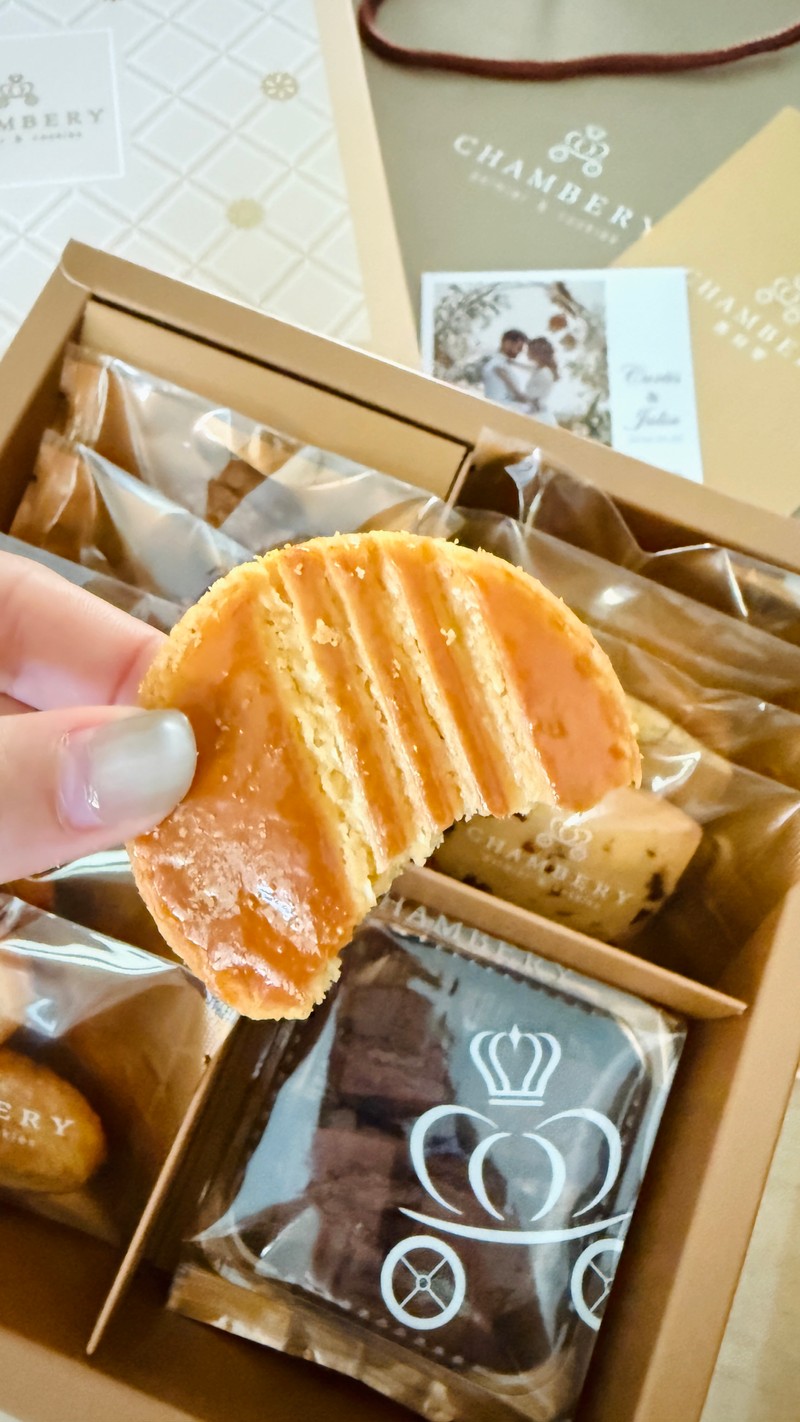 另外巧克力鹽之花以及黃金乳酪方塊也非常推薦!巧克力鹽之花尾韻有可可高級的微苦韻味;黃金乳酪方塊辣辣的味道增添的整盒喜餅的口味層次!