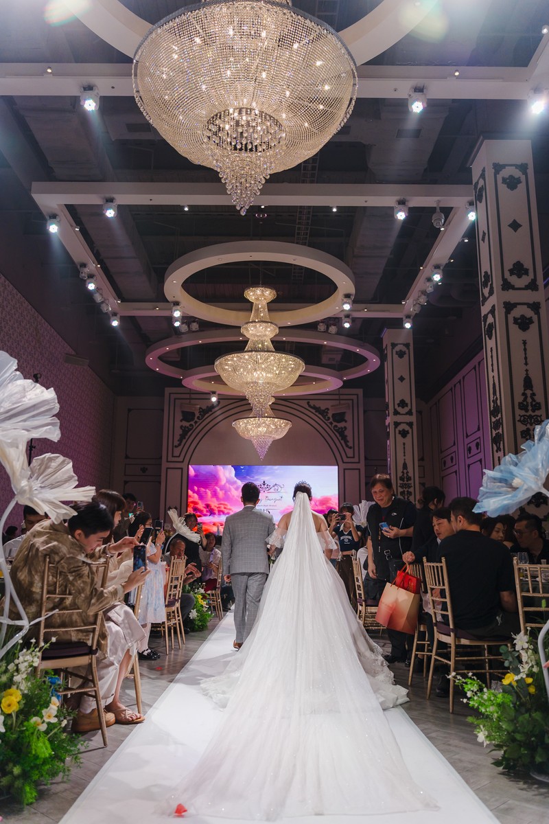 挑高天花板加上燈光的美,停車位相當多,說是有一千多個,新娘休息室大到沒朋友,下訂還會送主持人的服務。當天有請佈置廠商,大家都說場地很美。