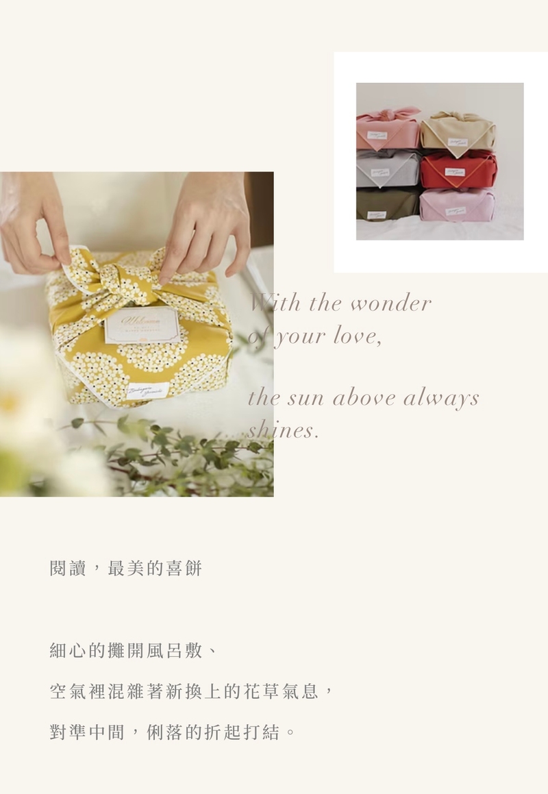很喜歡布巾有各種花色可以選擇,一來真的很環保不需要塑膠袋,二來讓整個餅乾禮盒都非常精緻有質感!很喜歡💕