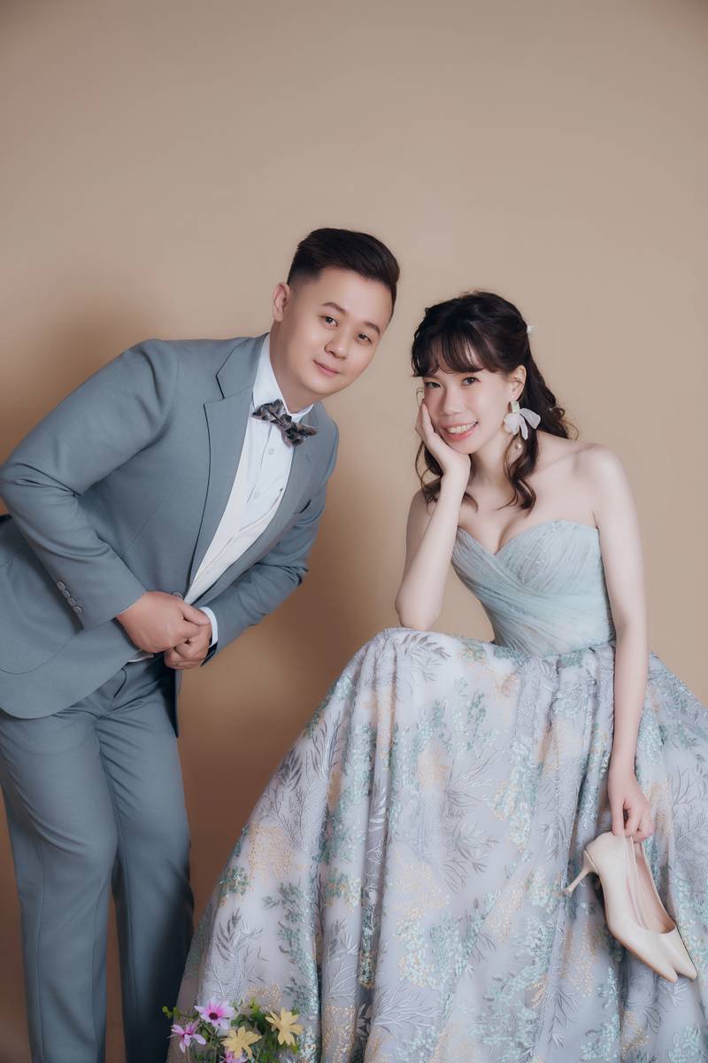 這一套完全是我老婆的夢中情裙 淺藍灰色禮服配上花草刺繡細節,柔和又帶點森林系感覺,造型師幫我搭配浪漫公主頭和花朵耳環,甜美又不失氣質。我自己穿上霧藍西裝,整體配色超搭!
