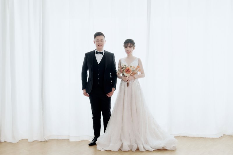 第一套老婆選擇了純白窗紗背景,搭配乾燥花捧花和氣質婚紗,整體風格非常乾淨純粹。禮服是帶點閃片設計的V領款,既優雅又不會太浮誇。我的則是經典黑西裝,帥氣又正式,是婚紗照中最耐看的經典組合。