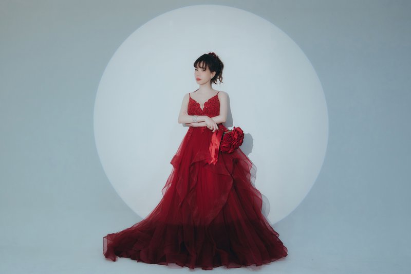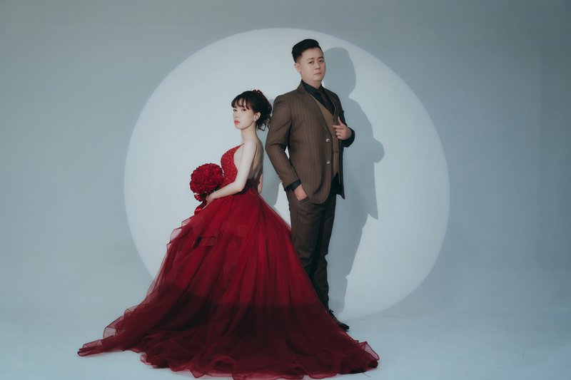 壓軸的紅禮服造型氣場全開!這套是我老婆一試穿就馬上決定的款式,深紅澎裙配上盤髮與大紅花球,拍起來超有氣勢 攝影師Zack設計了圓形光影背景,整體氛圍感瞬間升級,真的拍得超美!