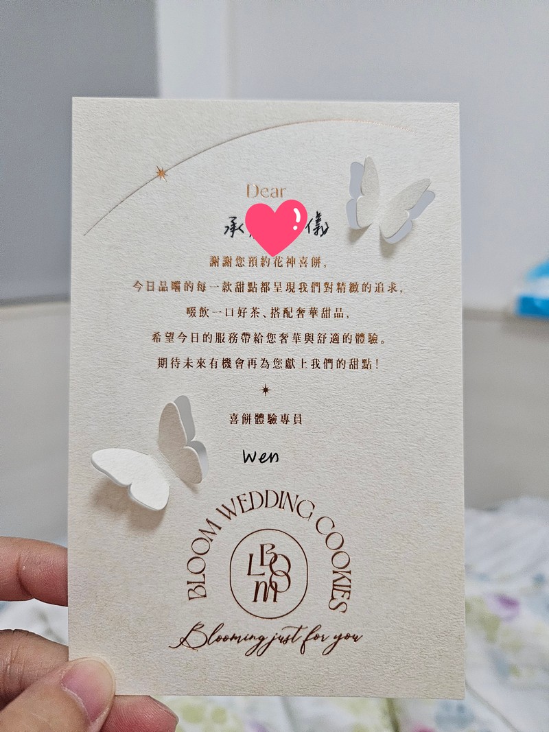 整體服務超級優,餅乾精緻好吃,外盒又漂亮大方,喜餅推薦花神!!