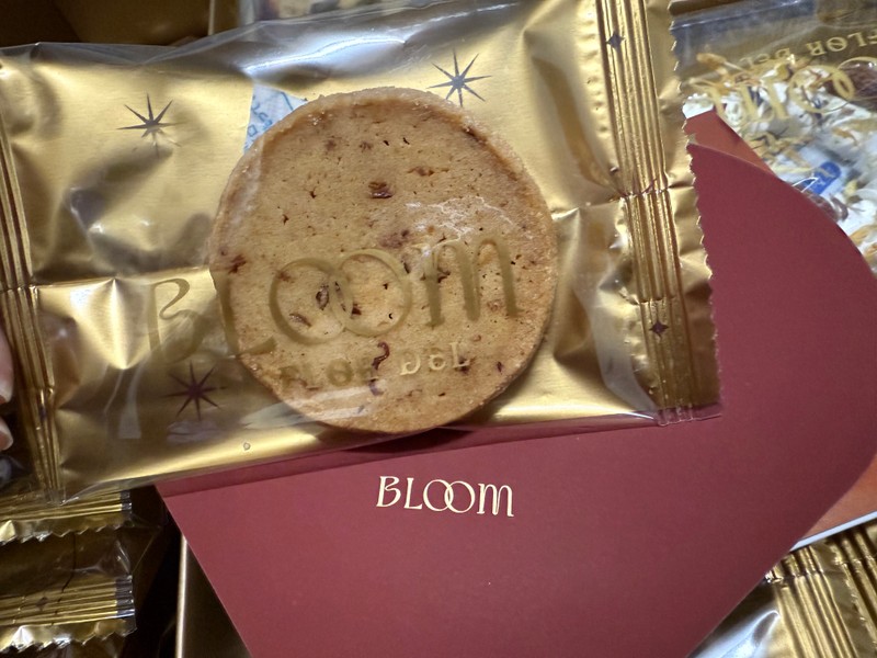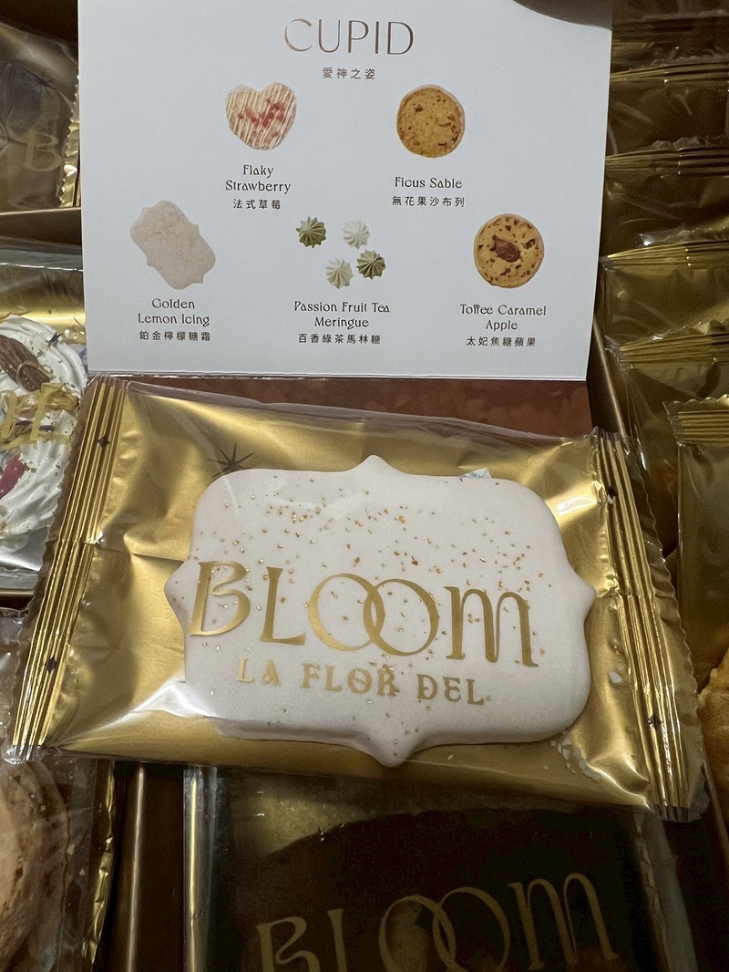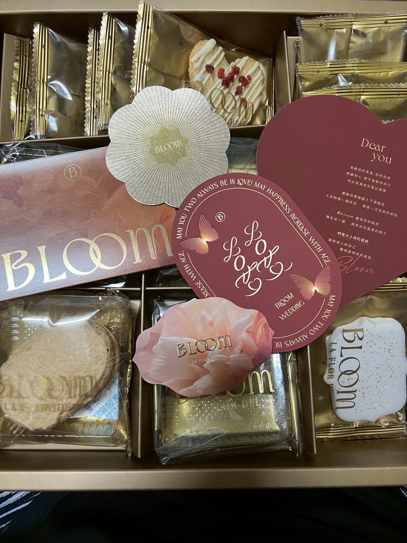 我喜歡包裝有質感,然後餅乾可以有別於連鎖店的口味,因此開始做功課,剛好有6月好婚市集有辦展,可以一次看比較多家,其實也是抱著看看的心情去的,一開始大致上先轉一圈,把口袋名單都看了看,最吸引我的就是Bloom 花神精品法式喜餅,不管是包裝還是餅乾都很合我的胃口,馬上跟老公討論,老公也很喜歡包裝,他是金色控,看到袋子就說行了,展場優惠也很大,就這樣跑了3次後,我們決定下訂,選擇18入想讓賓客們吃好吃滿,下訂後會寄一盒試吃禮盒,可以與家人一同討論後,再決定品項。
