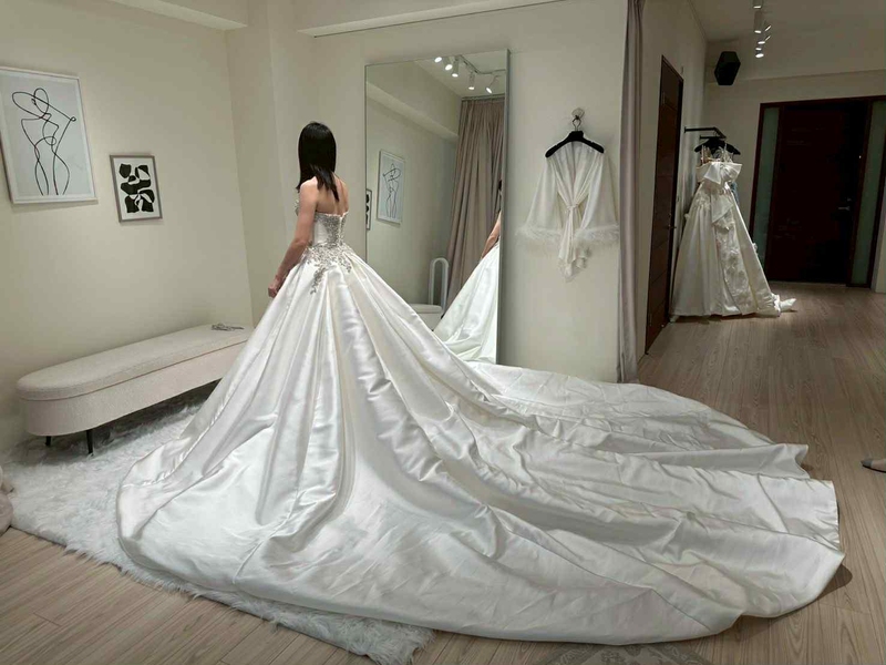 服務我的店員很有耐心,不好意思我沒記住名字,是一位帶粉色眼鏡綁馬尾的店員。因為第一次時間不夠,所以我有去了第二次專挑禮服,那一天我試