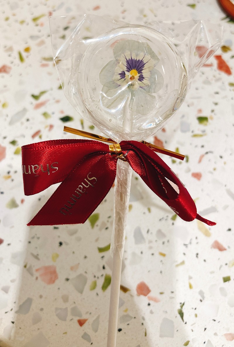 我最喜歡的是紅心芭樂磅蛋糕和蘋果費南雪,酸甜清爽又有質感;先生則偏愛百香綠磅蛋糕和嘎逼可可,有濃厚大人味。還有那款用真花瓣包裹的花瓣棒棒糖,是用甜菊糖製成,花瓣紋路超細緻,像小藝術品一樣捨不得吃。