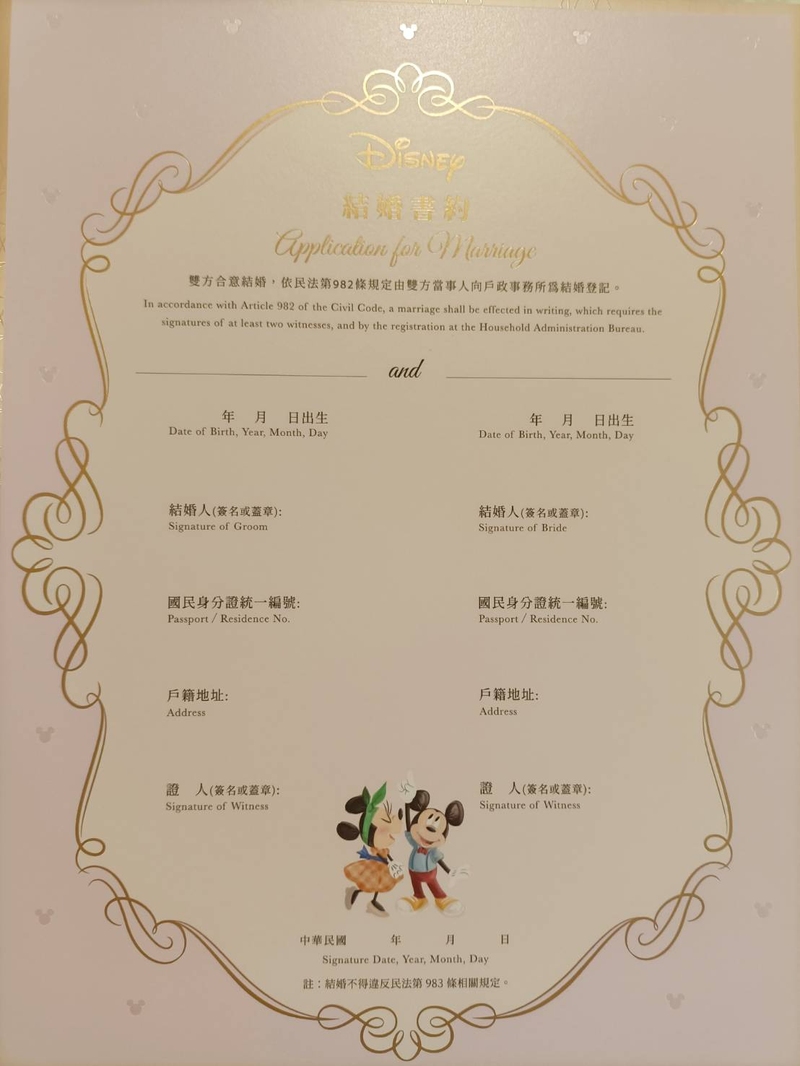 6.【介紹】亞立詩成約之結婚書約,一式兩份,含封套,正版迪士尼,字體燙金,整份紙面上皆壓有可愛米奇頭像,紙質質感好,因已登記所以用不到,出讓給喜歡迪士尼的學妹們唷~!