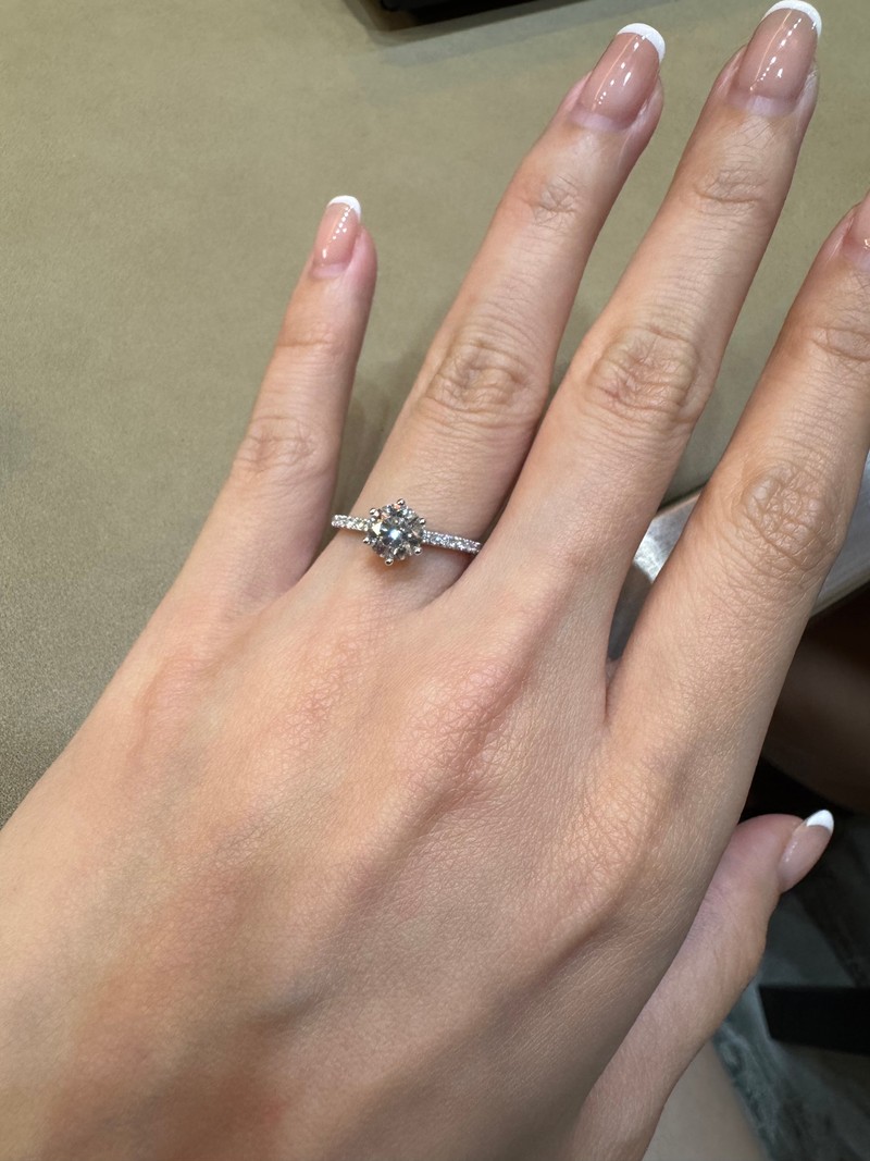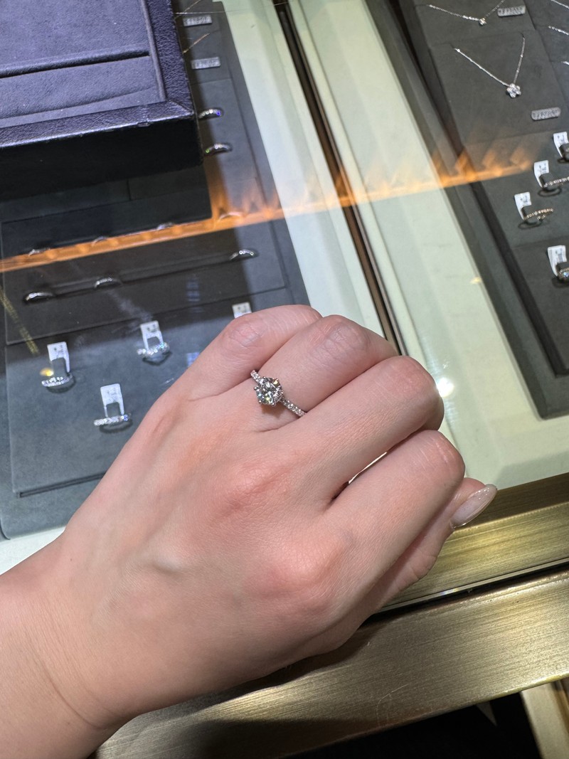 當天我試戴了幾款,最後選中一款有小水鑽點綴的戒台,線條俐落但又帶點閃耀感,是我一眼就愛上的那種設計。