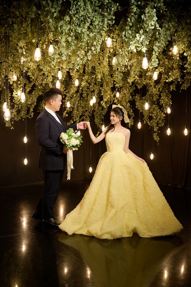 我自己選的那件婚紗也是一大亮點。當時猶豫了好久,禮服師“Claire”不厭其煩地陪我試穿、討論,甚至給我建議說哪種剪裁在鏡頭下最有戲。最後挑中的那件夢幻白紗,不但線條完美貼合身形,布料在燈光下更是自帶仙氣,像是隨時會飄起來一樣。