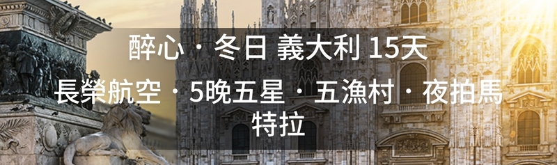 這次我們報名的是雋品旅行社「醉心・冬日 義大利15天」行程,預計2026年3月28日從桃園搭乘長榮航空直飛米蘭,展開夢想中的義大利之旅。人生中第一次踏上義大利的土地,選擇雋品是因為它行程設計非常吸引人,強調住宿品質、餐食安排與深度體驗的結合,非常符合我們的需求。