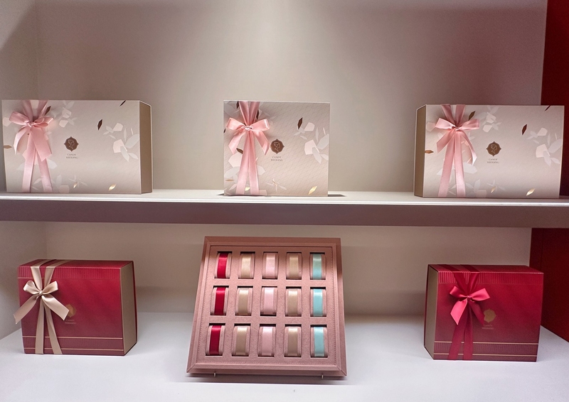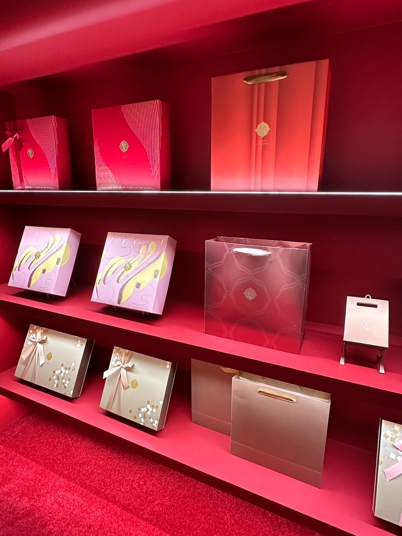 餅乾試吃結束後,便引領我們到禮盒展示間,詳細告知各種禮盒的差異,禮盒顏值漂亮真的為喜餅加分不少,尤其是粉色禮盒典雅有質感,搭配不同緞帶更是帶給禮盒不同的氛圍,緞帶基本上就是禮盒的特色,無須擔心親友們收到禮盒拆封後緞帶就綁不回去,因為禮盒是從側邊拉開,完全不會影響緞帶美觀,另外有新推出無緞帶版的禮盒,外觀設計相較於其他舊款新穎,提袋是低調玫瑰色非常好看,還有一款巨無霸禮盒,送給辦公室同事們的首選,禮物盒的設計,緞帶拆開就拆掉了,每個禮盒有各有優點及限制,可針對自身需求去做挑選;展示間裡還有間小密室,透過小卡開啟,展示著翻糖餅乾,翻糖餅乾可客製新人代表的英文字母,更是賣點之一。