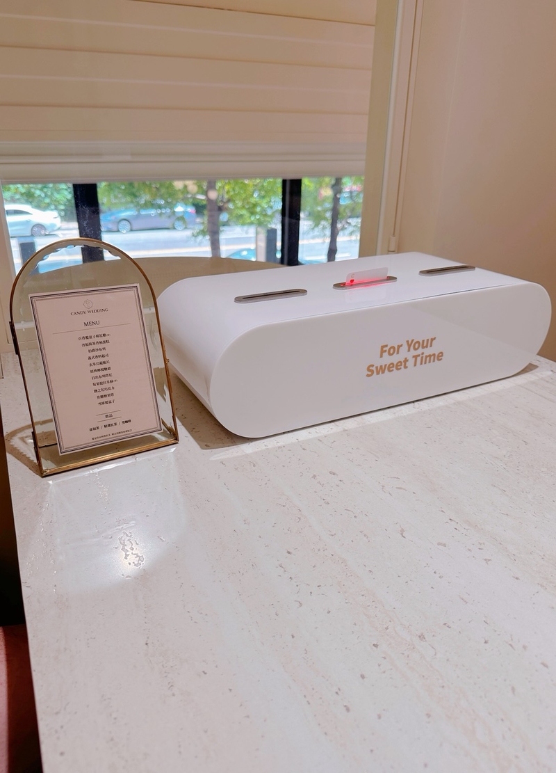 到了試吃當天,一進門服務人員就熱情接待,並給新人一張神秘小卡,就引領我們上樓,來到一間半開放式的空間,小卡可插入音響讓我們自行挑選輕音樂,並請我們從3樣飲品挑選飲料,另附上水供飲用。