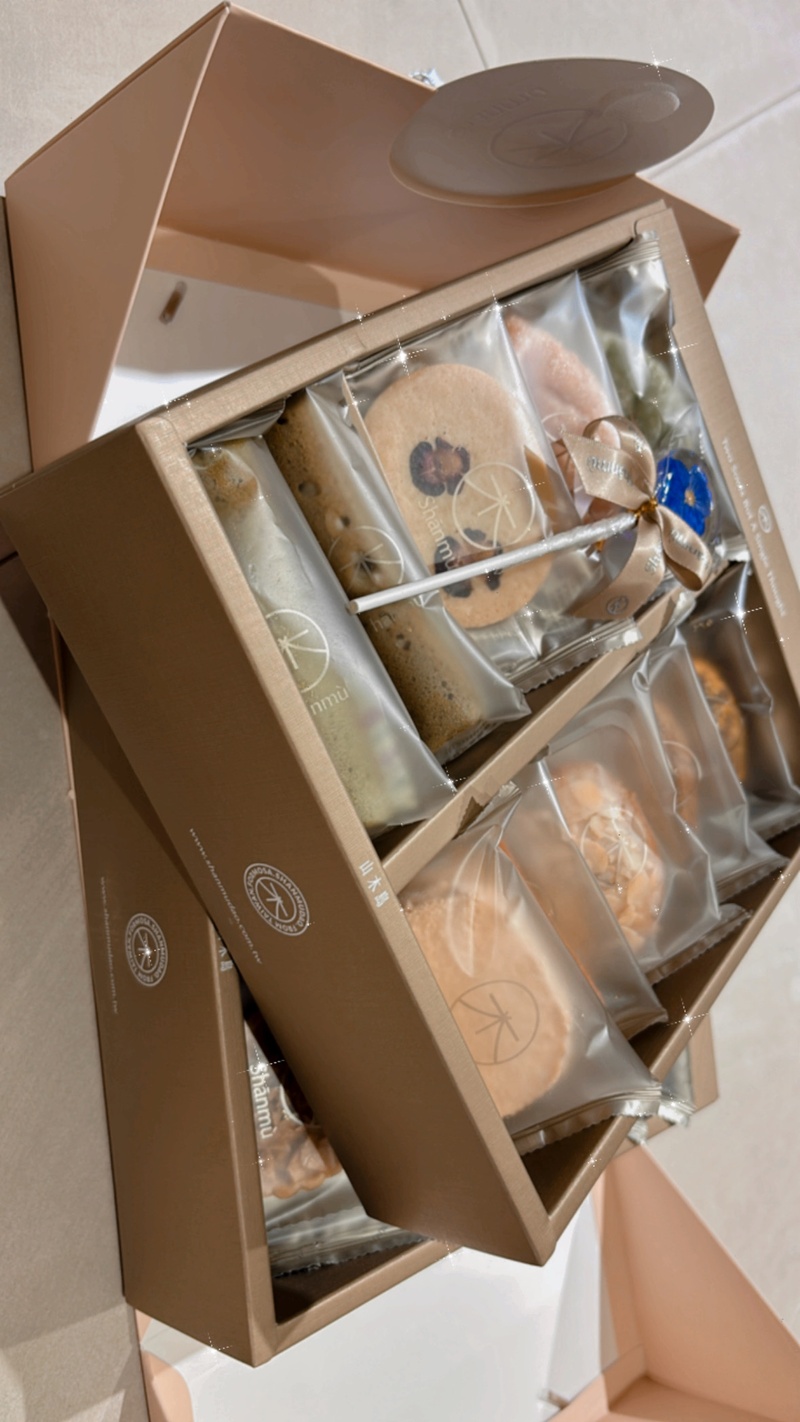 試吃品也給的超大方,是一個金色小盒子,裡面裝了7-8種招牌口味,我們隨機取了三片試吃,直接驚艷了我們的味蕾。最喜歡的就是嘎逼可可了!巧克力系列就是每家西式喜餅必備的,因為是苦甜口味,所以跟其他家都不一樣,我們吃了第一口就決定是它了。其他還有洛神火龍果森林酥、情人果達克瓦茲都讓人唇齒留香。