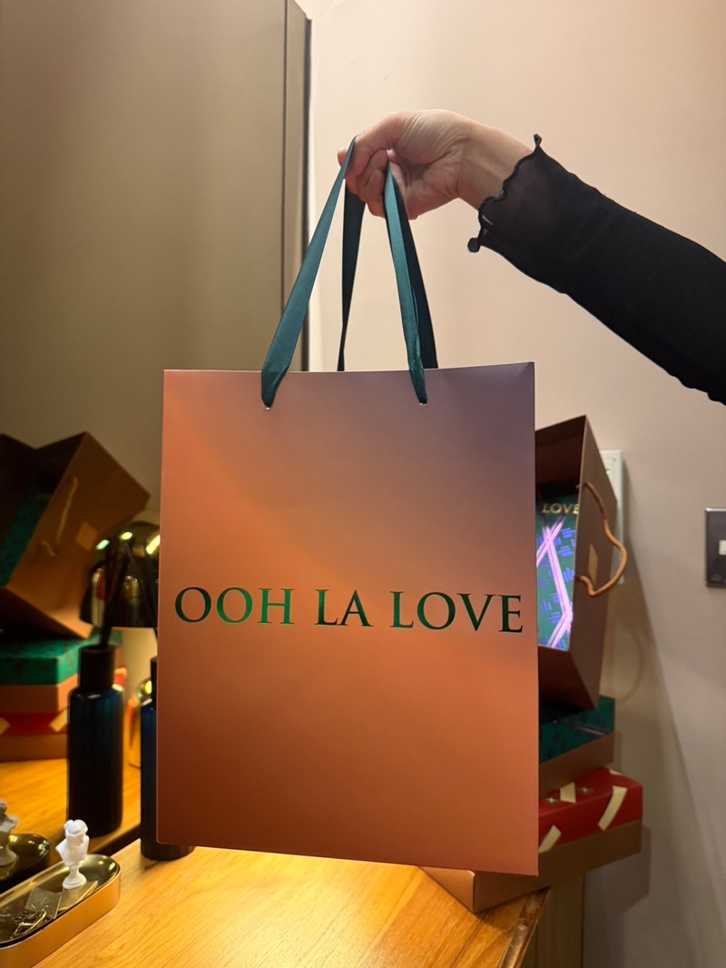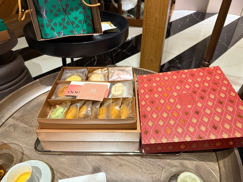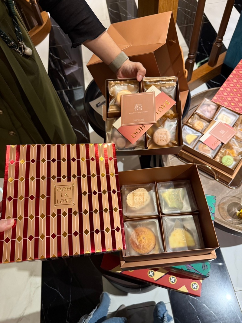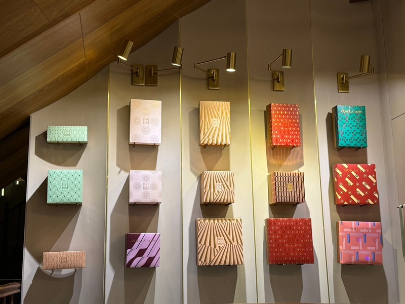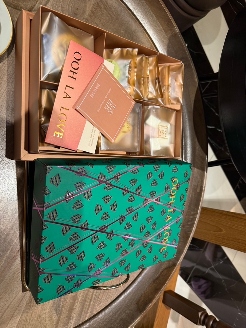 這次試吃的是 ooh la love 的喜餅禮盒,整體給人相當精緻、時尚的感覺。首先在包裝設計上,牆面上琳瑯滿目的禮盒色彩繽紛又帶有幾何設計感,每一款都有獨特風格。實際拿到手時,盒身質感厚實,燙金字樣讓整體顯得高級,搭配漸層手提袋,無論送禮或婚禮使用都相當體面。