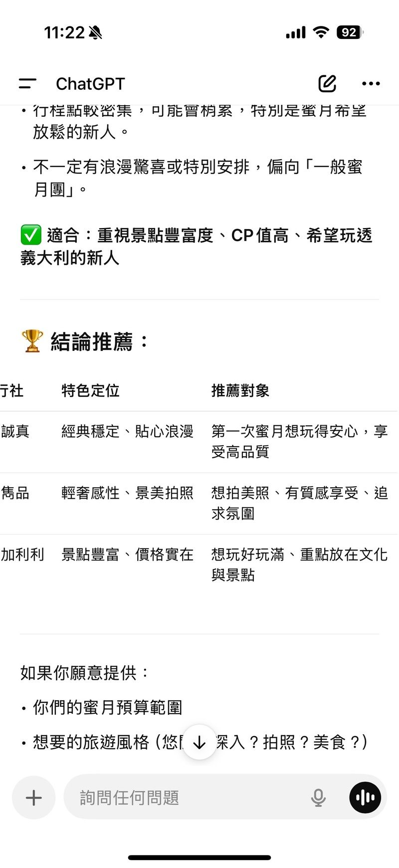 後來我也把幾間常見的蜜月旅行社讓ChatGPT幫我評估一下,ChatGPT說的雋品是:主打輕奢蜜月,適合重視拍照及生活美感的人,但就是價格較高😆😆😆價格是自己的問題,不是雋品的問題,基於朋友跟ChatGPT評價都不錯,就馬上聯繫上雋品的業務芸嘉,回覆都非常清楚且有效率!今天已付訂金,已經開始期待義大利的蜜月旅行了😆😆