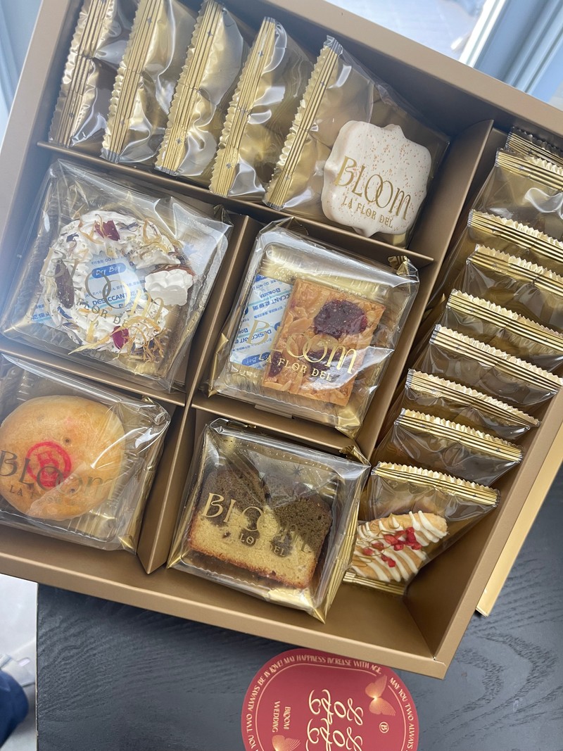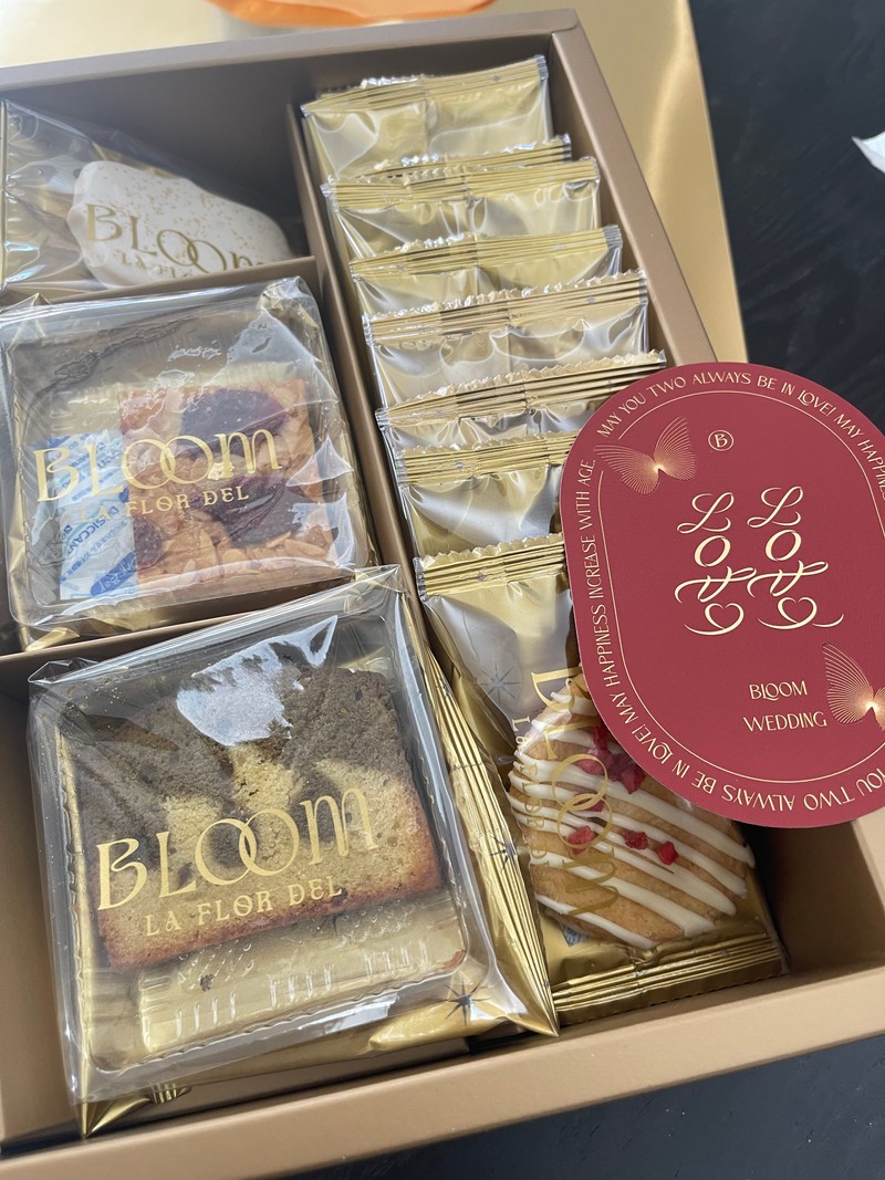 在搜喜餅樣式時,有些真的很美,但我個人比較喜歡餅乾是獨立包裝的,不會太擔心餅乾全部軟掉,預算上是700-900,有很多家喜餅都在這些條件中,最後我選擇 #花神 ,第一眼被他們的外盒吸引,超級美~~~金色手提袋好好看,連長輩都喜歡,拿在手上顯得大氣而不俗,看完立馬宅配試吃,當時試吃四家對比,有對比優勢就出來了,餅乾不會死甜,重點他們家的達克瓦茲好好吃🤤(圖片沒有因為立馬被我吃掉了🤣)
