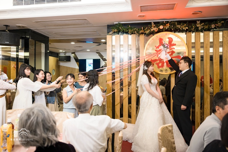 新娘跟主持人節奏剪下緞帶,最後沒有剪斷的緞帶,就是捧花得主