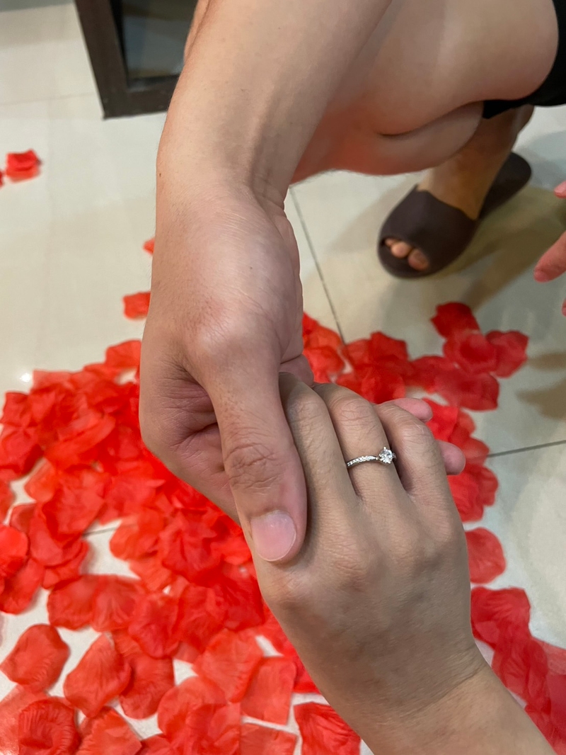 愛情長跑五週年,今年的五月無預警的被求婚了,當他跪地拿出戒指盒接著打開一枚鑽戒出現在我眼前,他問我願意嫁給他嗎?我說:我願意。
