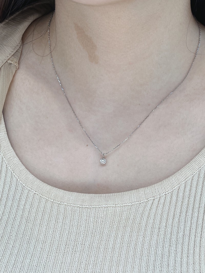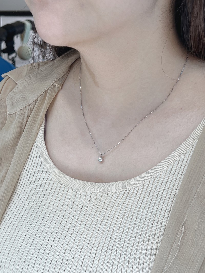 這次,我們想挑選一條能代表心意的鑽石項鍊。 在 Judy 的推薦下,我們一眼就愛上了一條設計簡約、優雅大方的款式。 這條項鍊的鑽石切工極其精細,每個角度都折射出動人的光芒。 它不只是一件飾品,更是能完美搭配老婆日常穿搭,也能在重要場合點綴華麗的經典單品。