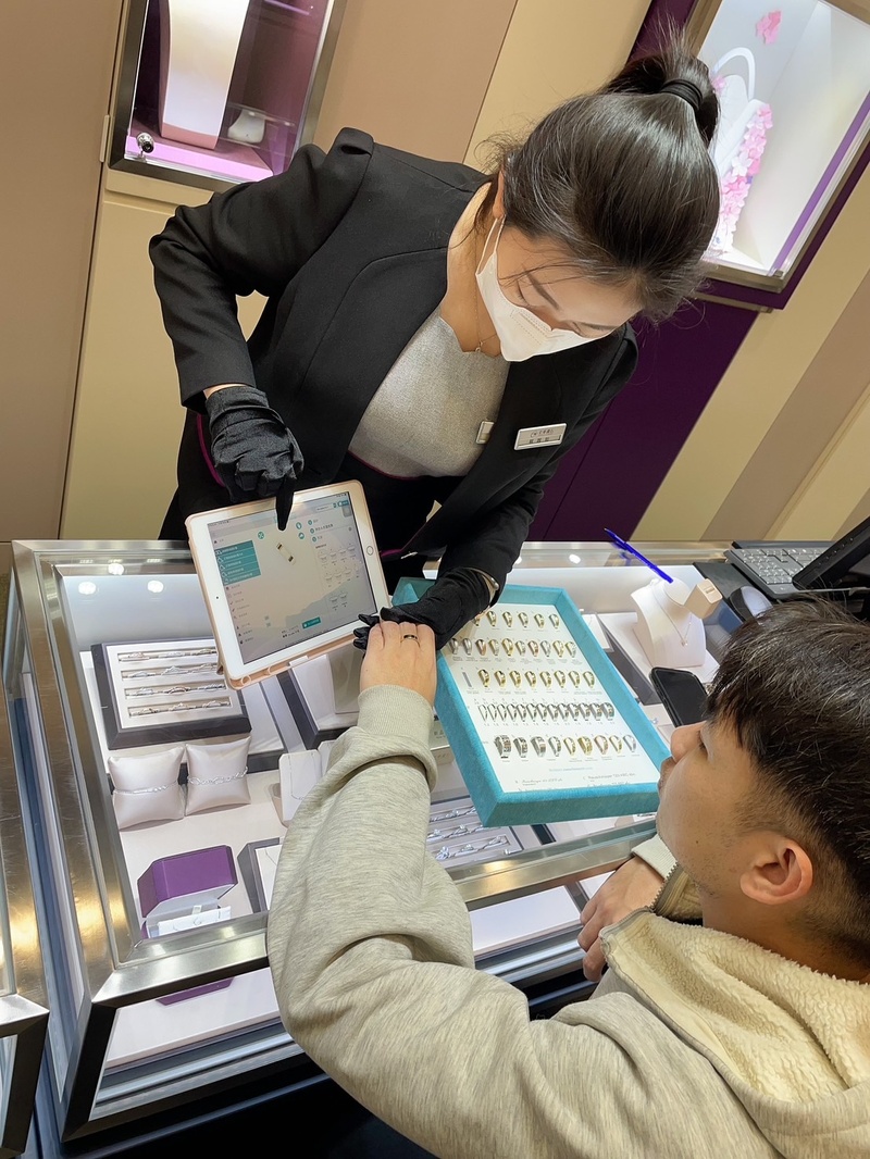 新營店服務人員拿出兩大盤道具超級精緻,竟然可以從版寬、戒指形狀、材質顏色配置、鑽石排列等等都可以依照我們想要的去客製!