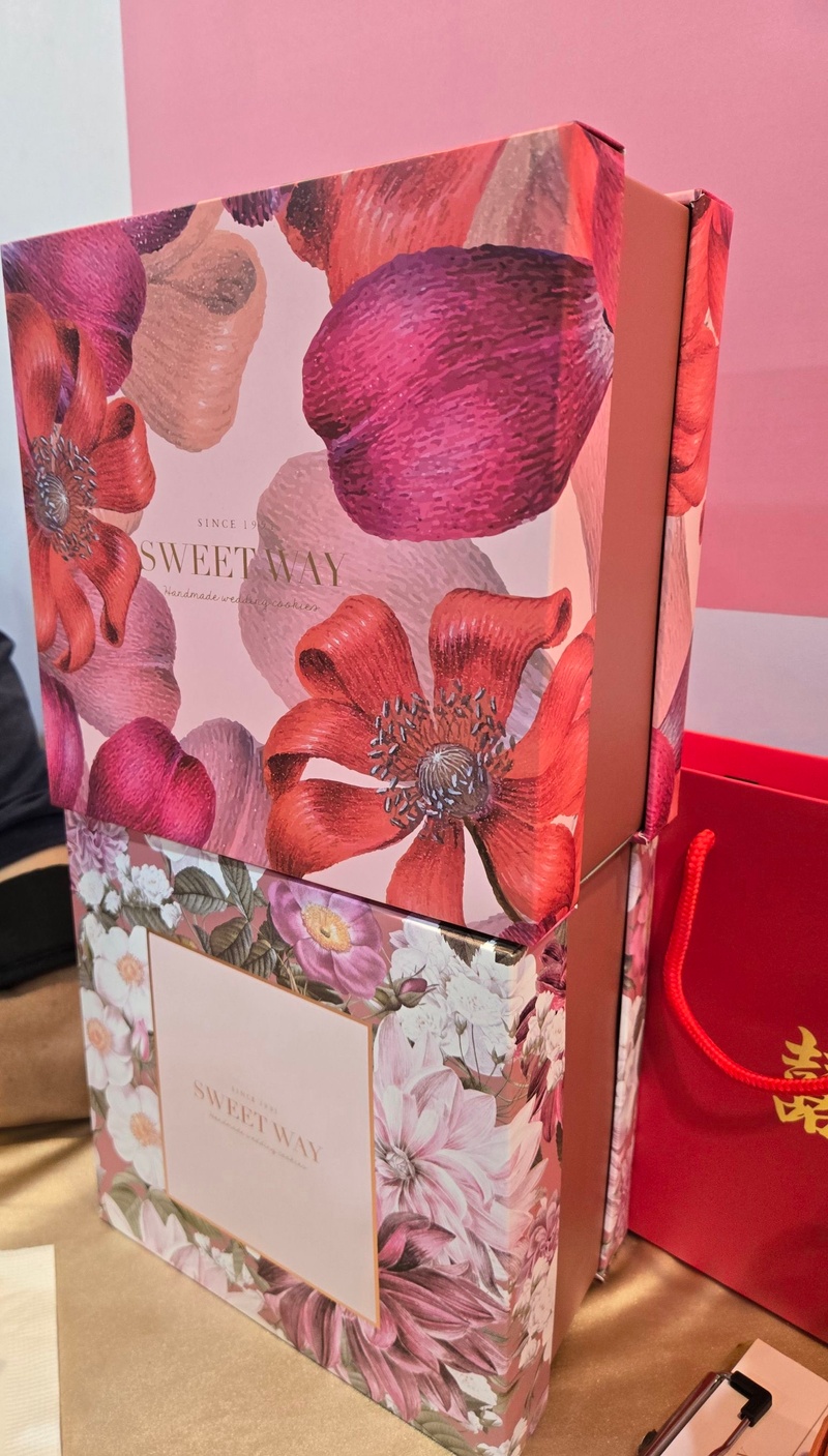最加分的是他們推出中西合併的組合設計,一盒就能同時滿足長輩與年輕人口味,實用又貼心。整體來說,SWEET WAY 給我的感覺是「用心又有格調」——不只味道好,從包裝到服務都展現細節,是婚展中讓我特別記得的一家品牌。