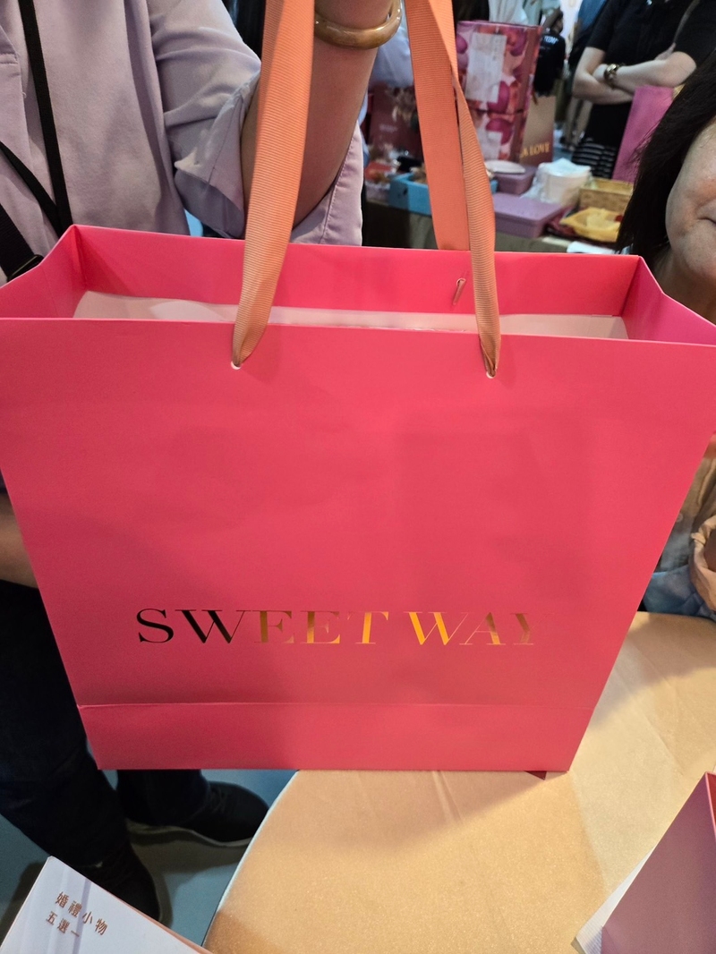 第一次注意到 SWEET WAY 世唯喜餅,雖然沒聽過這品牌,但他們的攤位設計與包裝真的讓人印象深刻。整體以玫紅色搭配花卉圖騰,質感高雅又帶點浪漫氛圍,提袋和禮盒都很有份量,送禮體面又不流於俗氣。