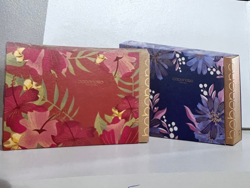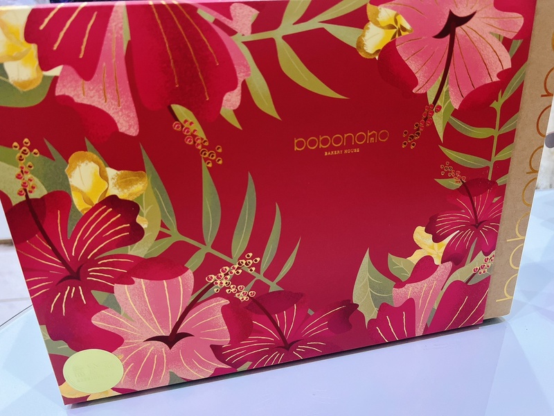 吃完之後,服務人員拿起他們家的盒子,我是一個滿喜歡色彩繽紛,卻不喜歡拘泥於傳統的設計,他的紙盒在設計感上,用了大量的花去襯托整個盒子帶來的美感,尤其是緋紅石榴與湛藍琉璃,這兩款紙盒是我一眼就喜歡的款式,當下我就選擇這兩款。