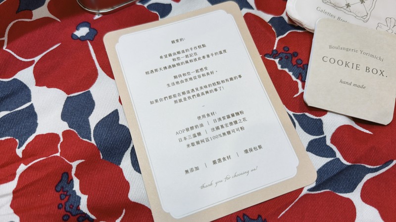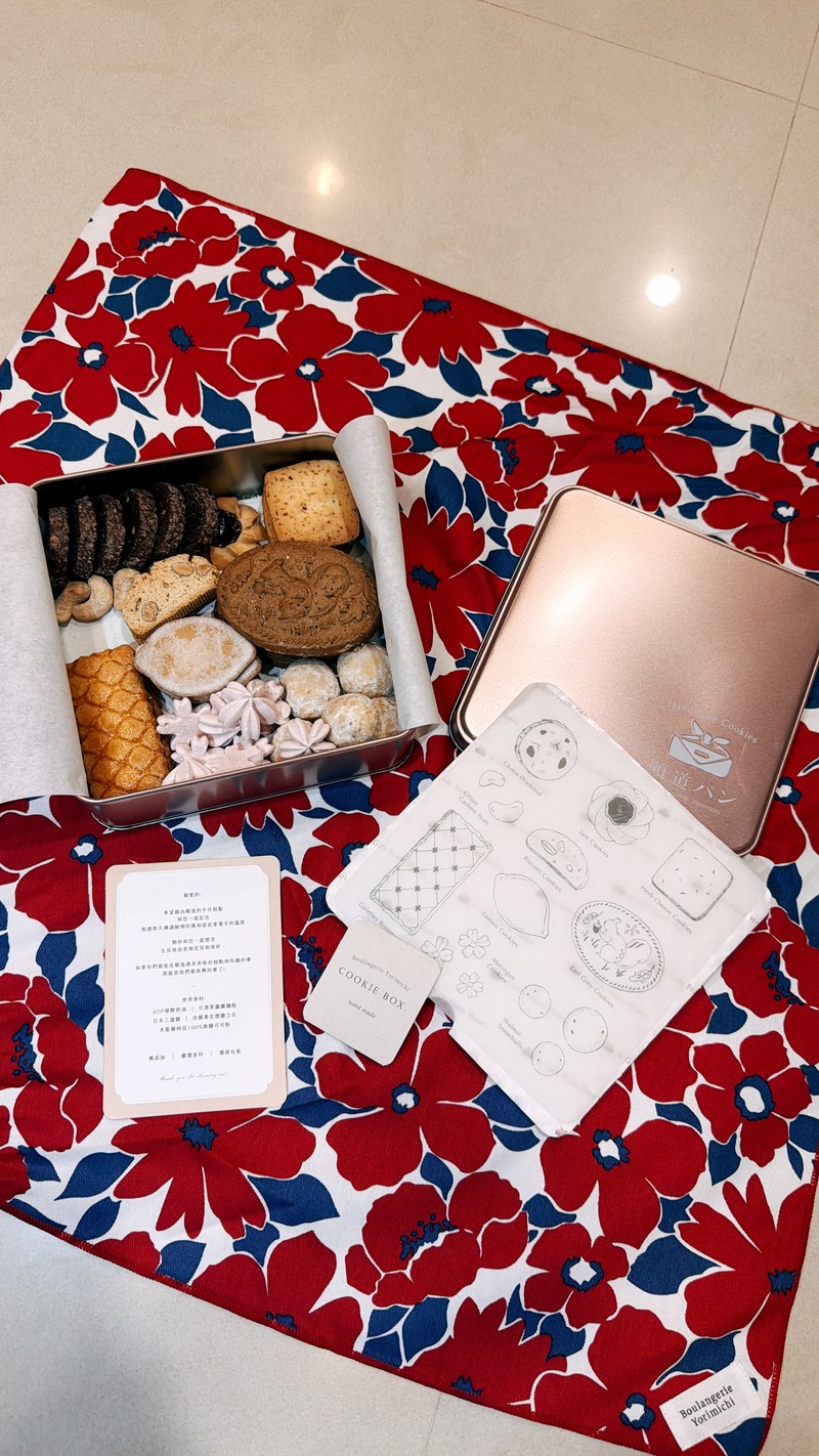 收到順道パン的試吃盒時,第一眼就被那塊印有花紋的布包裝吸引,搭配質感滿滿的鐵盒,整體給人一種日系溫柔又典雅的氛圍。裡頭的餅乾口味多樣,甜度拿捏得剛好,不會過於膩口,搭配茶一起享用特別合適。親友吃過後也都讚不絕口。最讓我們喜歡的是,那塊布外包裝不僅漂亮,還能重複利用,兼具美感與實用性,讓整份喜餅的體驗更有心意。