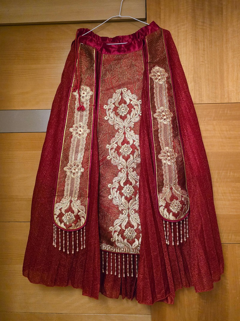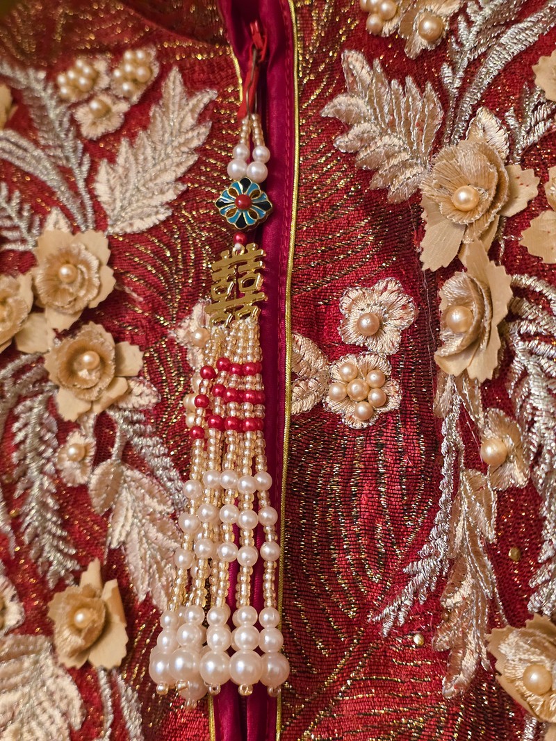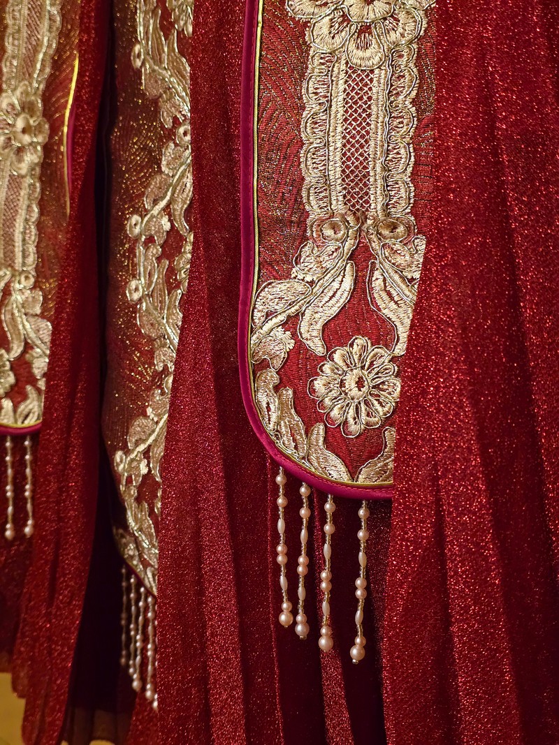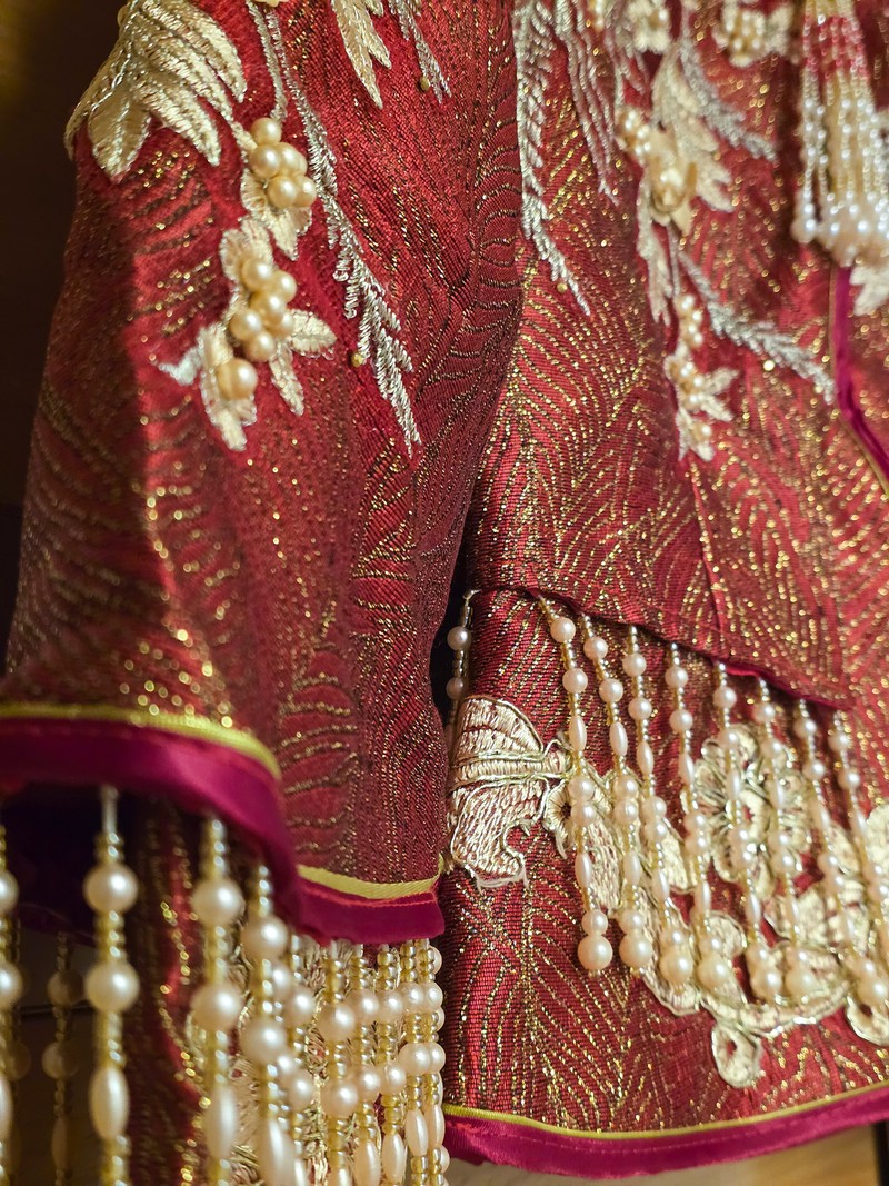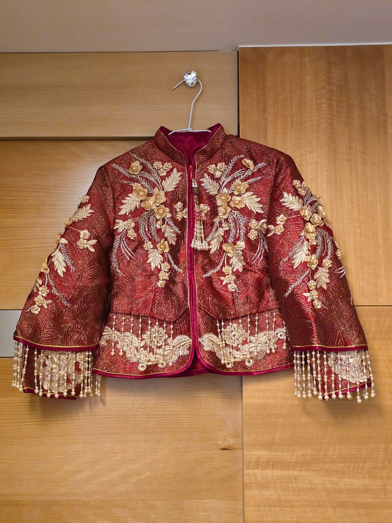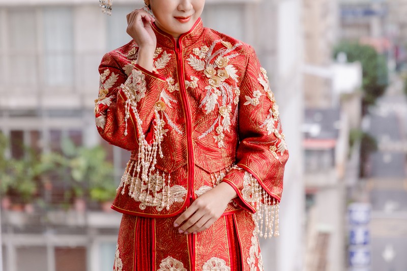 朱紅+金色刺繡,珠珠流蘇細節滿滿,華麗中帶著典雅氣質。