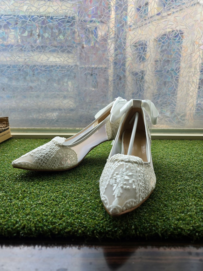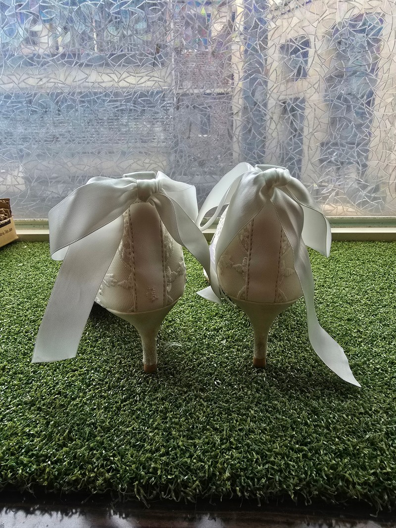 ・透膚蕾絲搭配蝴蝶結+包緞面鞋跟,甜美又典雅