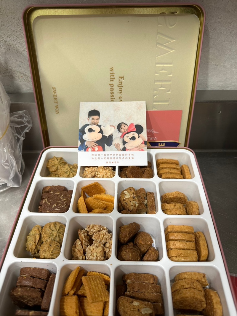 從結婚一直尋找中西式合併的喜餅,又很擔心分享給其他人吃會不好吃的口感,直到有朋友分享世維喜餅,看了官網的介紹挑選喜歡的喜餅,還好有專人回復LINE訊息,互動上都非常好也很有耐心為我解答,價位上實在不用擔心太貴,又有送很多小東西,都非常的精緻,收到貨非常都包裝精美,送出去又很有質感,更棒的是吃完喜餅的人都與我分享,每一格餅乾怎麼那麼好吃!!大餅我是選鳳梨椰果口感不錯!!