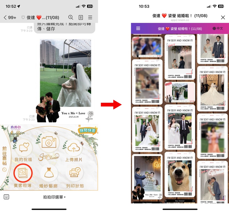 操作介面相當容易,只需要透過專屬的LINE帳號,讓賓客加入之後,就可以使用上傳照片、婚禮遊戲等功能,其中上傳的照片都會儲存在賓客相簿中,賓客隨時都可以下載電子檔,洗出來的效果也很棒哦!(下方就是我們的客客製化相框)在婚禮結束之後,拍拍印也會提供所有電子檔供新人在一定期間內下載留檔~