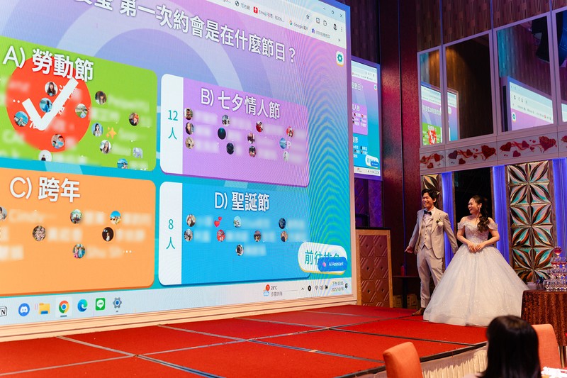 婚禮遊戲也有很多選擇,有互動性質的快問快答,也有抽獎性質的大轉盤,可以看每一場的需求來做搭配,像我最期待的就是透過快問快答來看一下賓客的反應,真的是非常的新鮮與有趣😆