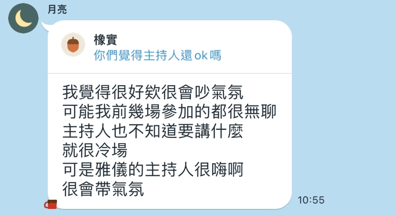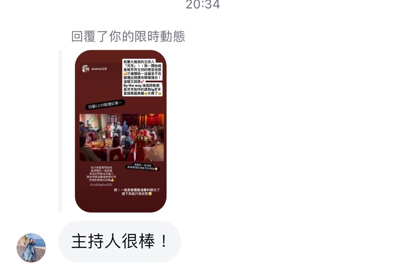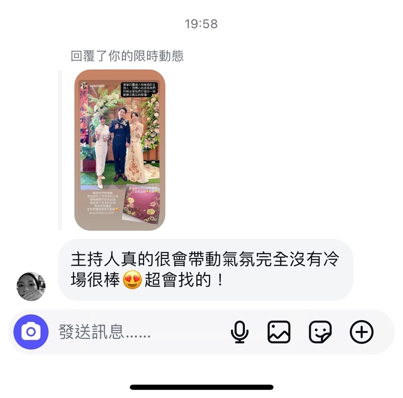 婚宴當天,芳芳不負我們所望,把婚禮主持的有聲有色,穿針引線讓整場婚禮非常流暢又有趣,當天在現場聽芳芳主持覺得她超有梗主持的很有趣,把台下賓客逗的哈哈大笑,很會炒氣氛完全沒冷場,讓賓客對於我們的婚禮留有很多印象點及好評。而且因為我們的活動有點多,當初很怕時間掌控不好影響送客,但芳芳完美控場按照表定流程送客真的太厲害👍