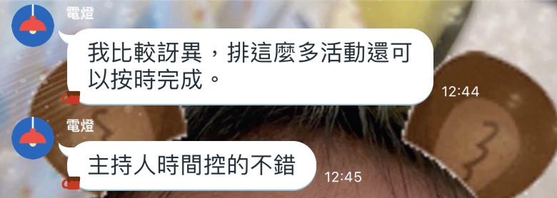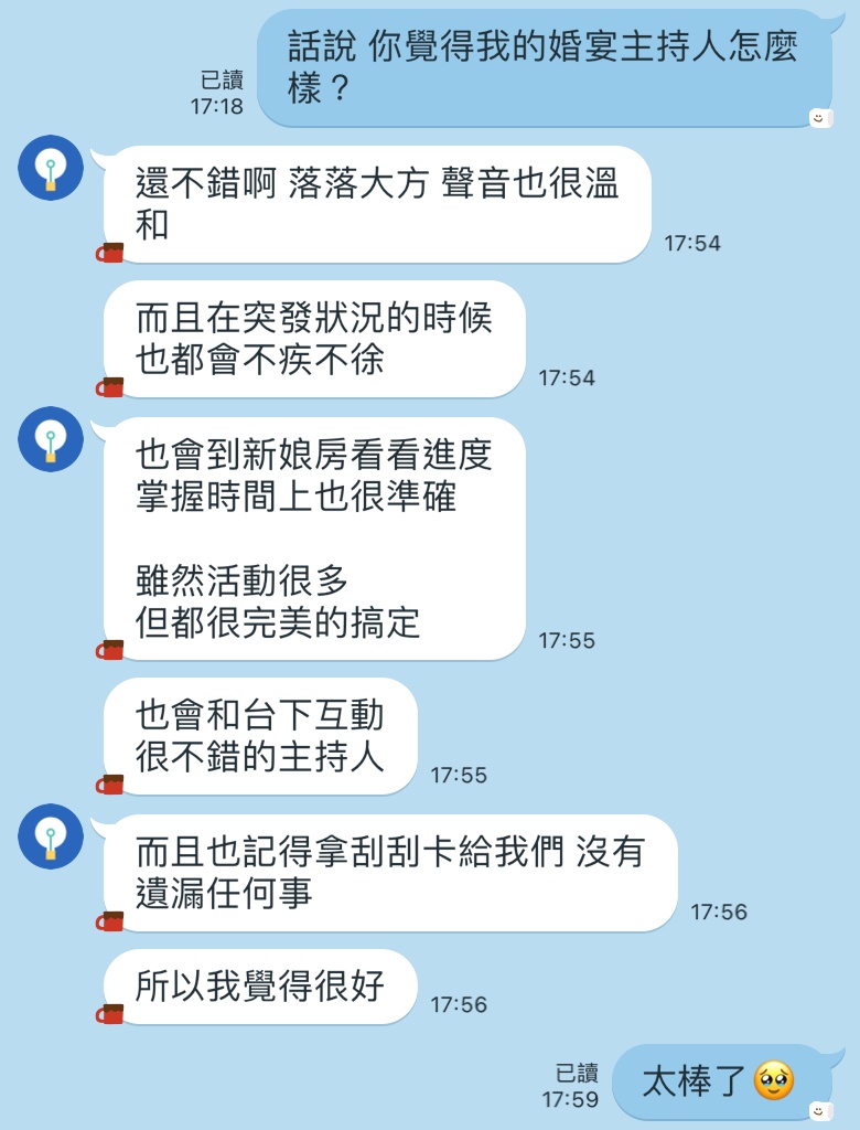 面談後再來都是靠line與芳芳溝通,基本上你有任何大小瑣碎問題,芳芳都非常快回覆甚至到晚上睡覺打擾她,她也常很快地在線上回應我,文字溝通也是非常清楚明瞭,總是熱情回覆我各種疑難雜症及想法,完全沒有一絲不耐煩或敷衍的感覺。甚至秘密完美配合我「唐伯虎點秋香」的構想並加碼幫我呈現出來,給了先生一個難忘的生日驚喜🤣