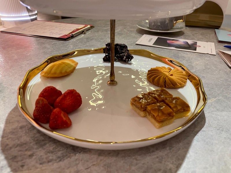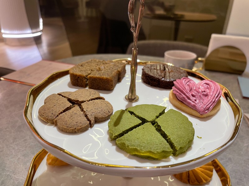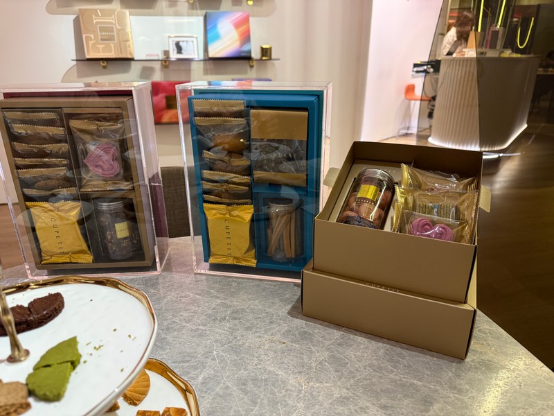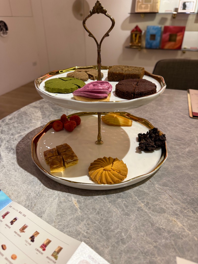 喜歡茶口味的餅乾,我們試吃了抹茶跟紅茶的餅乾,風味都很有層次!伯爵茶的磅蛋糕跟瑪德蓮很濕潤,非常美味!巧克力的布列塔尼是不喜歡巧克力的我都覺得好吃的,也試了看起來很喜氣的蛋白霜餅乾(粉色愛心形)酸甜口味、以蛋白霜製品來說非常不甜(誇獎),但下層我跟老公就只比較喜歡瑪德蓮⋯草莓凍乾就是草莓凍乾(可能看起來也是喜氣的選項)、巧克力米脆餅就以一個不懂巧克力的人來說完全吃不懂😅、鹹餅乾我們選了起司口味,吃起來普通可能是不愛甜食的人會喜歡,以及吃起來有點像牛奶糖的佛羅倫斯脆餅。