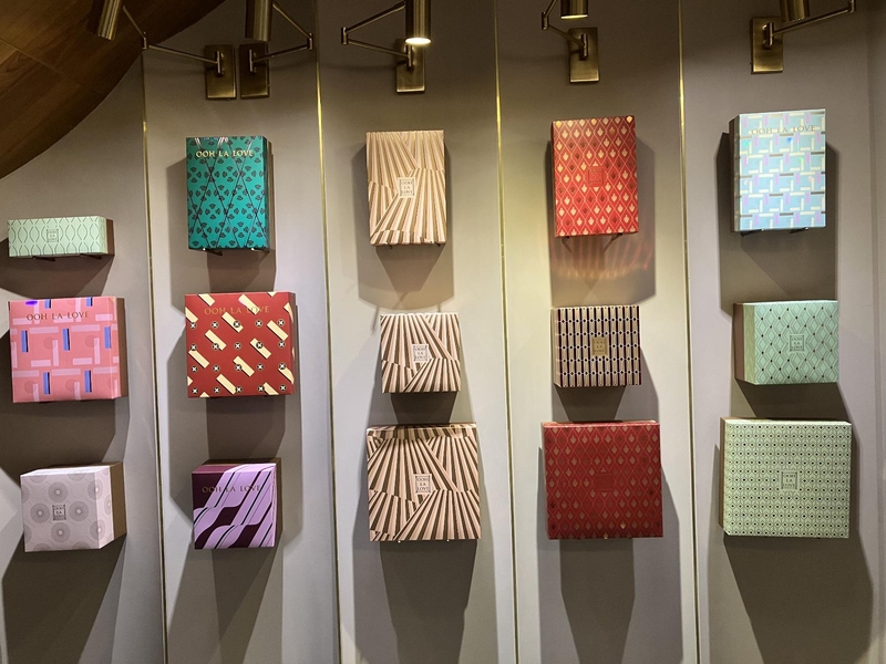 先看到一面的盒子展示牆,設計的風格很多樣也都很有質感,各種喜好的人應該都能挑到喜歡的盒子。平時我沒有特別喜歡紅色,但在這邊挑到了漂亮的紅金搭配禮盒,很繽紛又很喜氣喔。