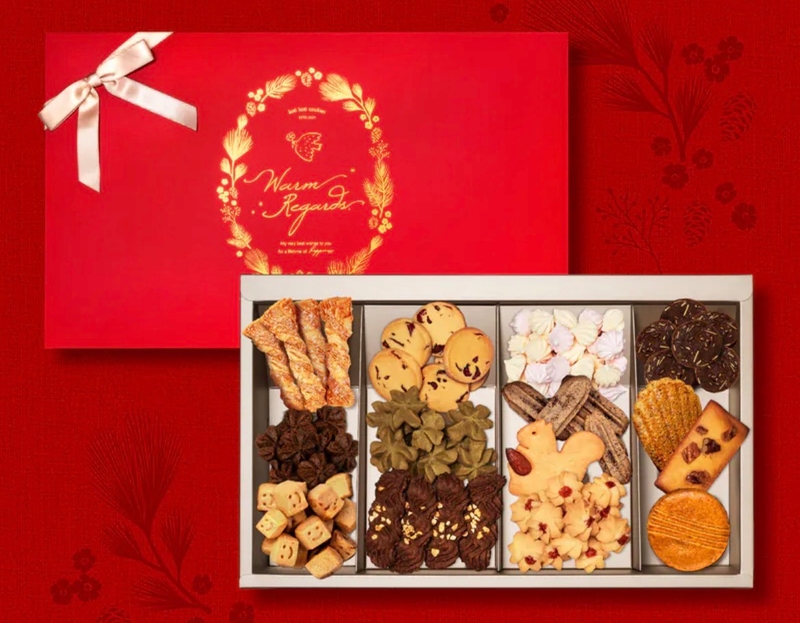 外盒包裝質感很好,顏色喜氣不浮誇,且有可愛的圖樣,很符合我們想要的路線。餅乾種類多但不失精緻,口味也都很有記憶點。