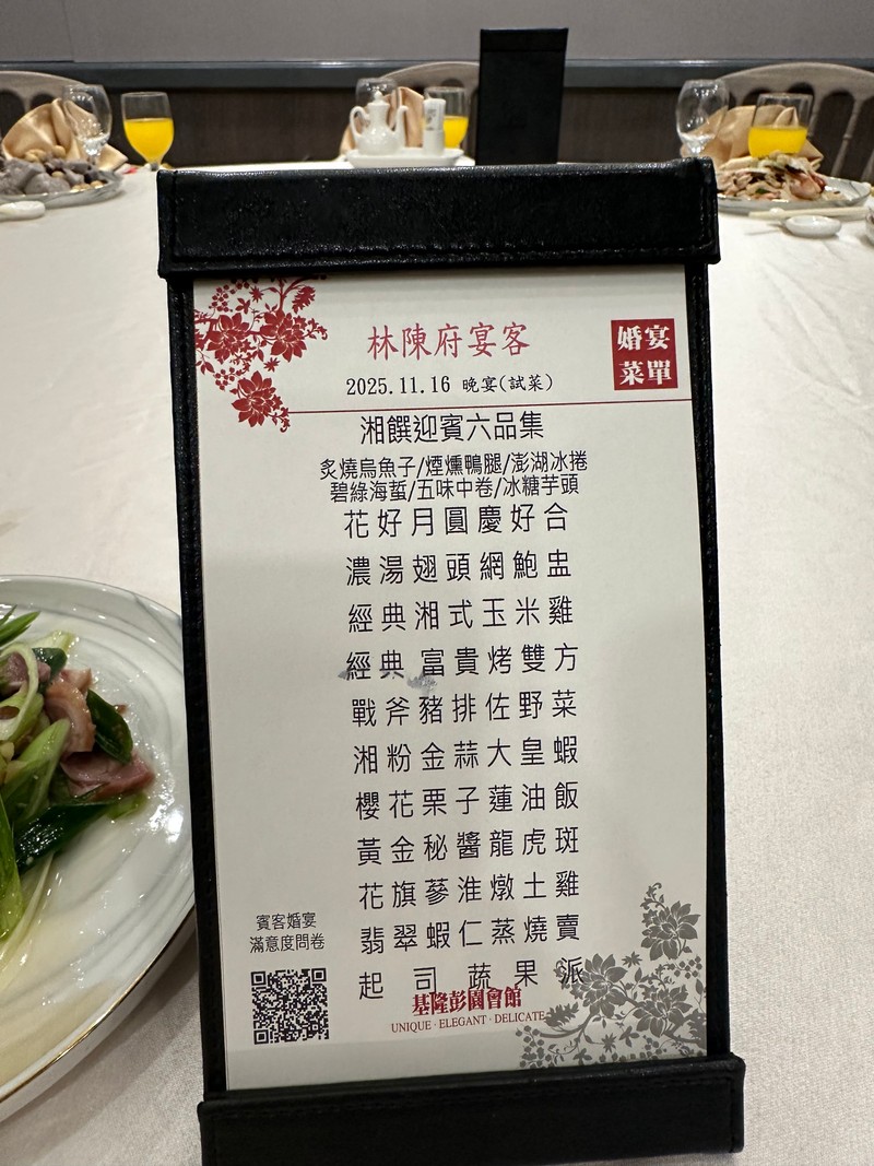 更值得一提的是菜單設計用心,詳細列出所有菜色,讓賓客一覽無遺,充分展現專業與細膩服務。每道菜肴不只美味,還兼具健康與創意,充滿驚喜。整場宴席流程順暢,服務人員親切有禮,整體用餐體驗極佳。無論是口味、擺盤、份量還是服務品質,都令人十分滿意。推薦彭園,接待人員Vicky也是非常熱情的招呼我們,像朋友一樣!無論婚宴或家庭聚餐,來這裡絕對物超所值,賓主盡歡。