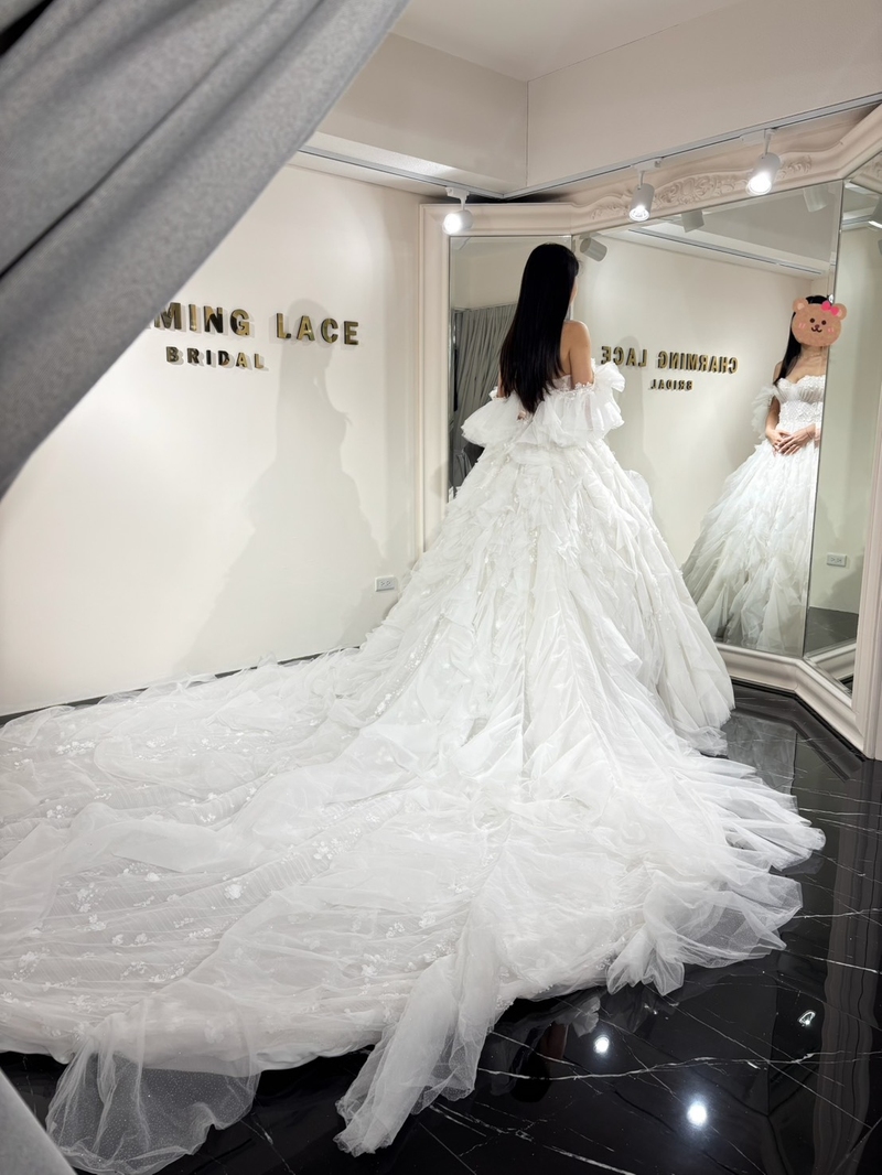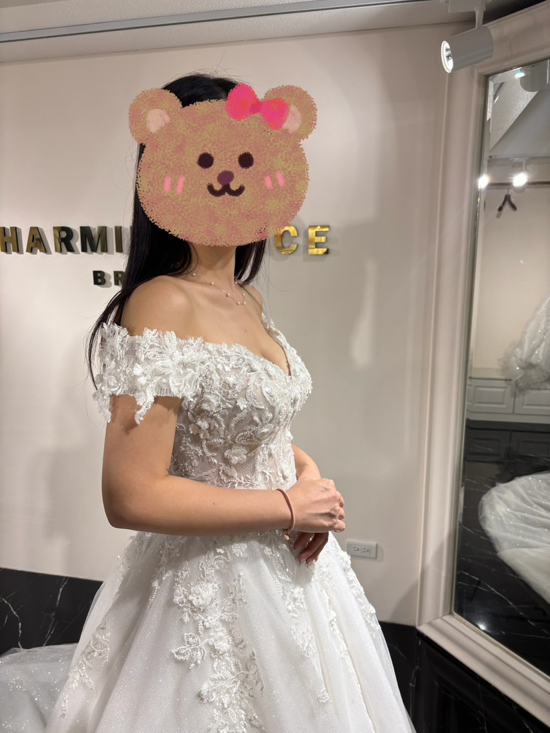 價位確實比一般婚紗高一些,但說真的,試穿完的我完全懂為什麼。那種質感、剪裁、整個被好好對待的感覺,真的會覺得很值得。