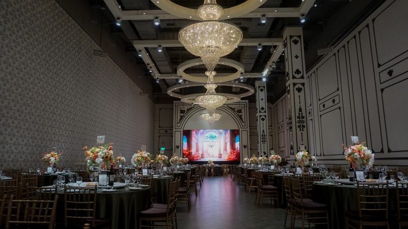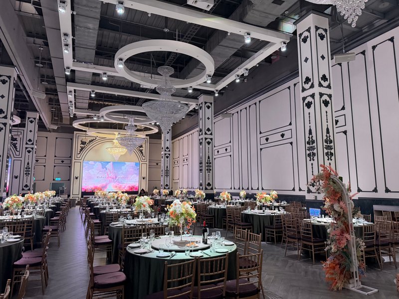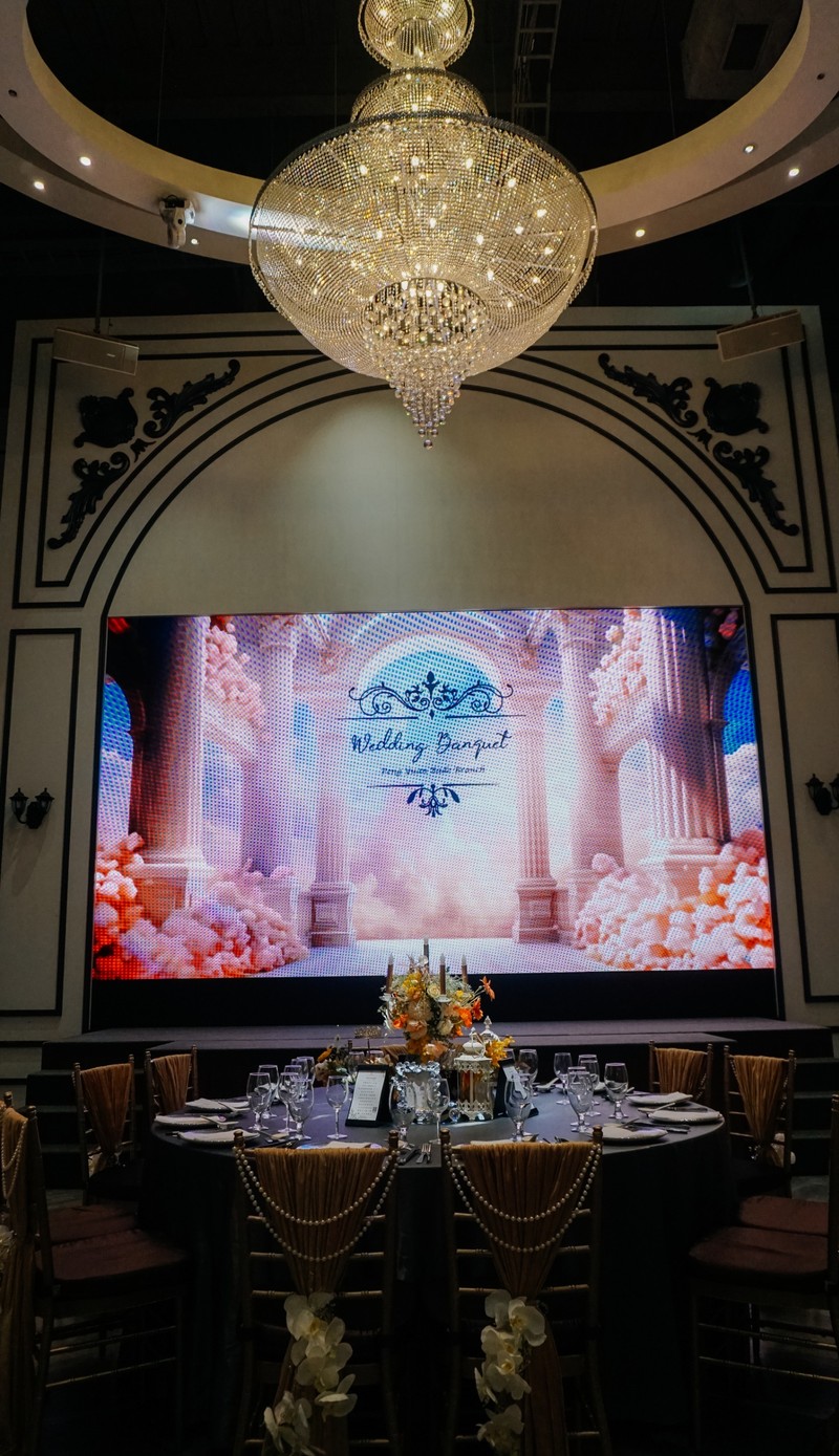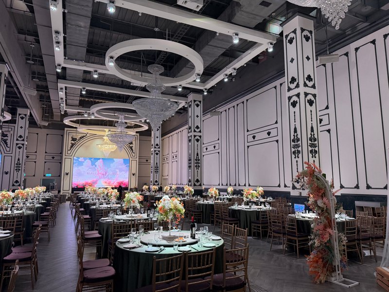 場內的專業影音硬體設備包含全彩投影設備、布幕、麥克風,以及高級音響環繞設備,燈光部分則有婚宴燈光情境效果以及專業聲光音控人員。