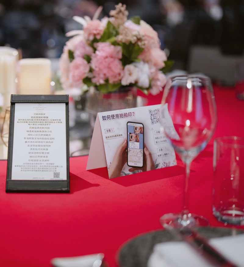 最令人驚豔的是,拍拍印同時解決了婚禮籌備中的許多痛點:專屬的LINE官方帳號能輕鬆統計賓客人數、發送婚禮資訊,甚至還有AI查桌次功能,讓當天的招待工作變得非常輕鬆。賓客們對於現場的互動遊戲(例如快問快答遊戲)反應熱烈,直說我們的婚禮氣氛很棒、完全不無聊。