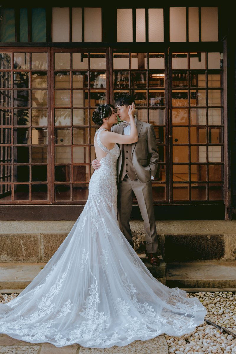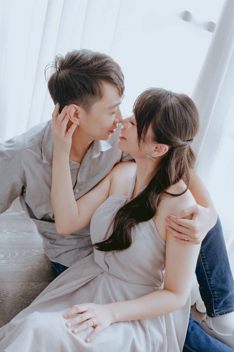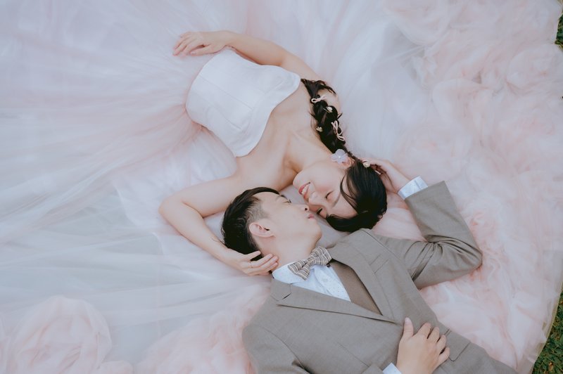 攝影師的部分,因為我們選擇的攝影師檔期很滿很忙碌,連在外拍車上都在用筆電調照片色彩,就不說明是哪一位攝影師了XD,攝影師事前會撥出時間用LINE跟我們討論想要拍攝的風格、元素,也會適時給我們一些建議,拍攝當天一開始覺得攝影師是個冷冷的人,後來才發現其實是個悶騷有趣的人,非常專業的協助指導新郎跟新娘的動作,也很擅長用道具盡量遮住新娘壯壯的蝴蝶袖XD,我們在門市給成品之前,就先在外拍車上看到攝影師在筆電上作業的畫面,瞬間覺得我們剛剛有拍過這張照片嗎?!真的拍得好好看!照片的色調也很美,而且小細節攝影師也會在拍照的時候就幫我們注意,所以看到門市給的成品時,很多照片不用精修我們就很喜歡了。
