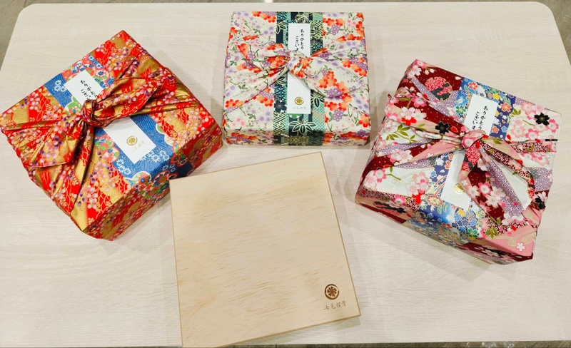 希望朋友們在吃完喜餅後,還能把我們的幸福印記帶回家。也因此,七見的風呂敷禮盒立刻吸引了我們;再看到木盒款式的禮盒時,真的有種「就是它了!」的感覺。