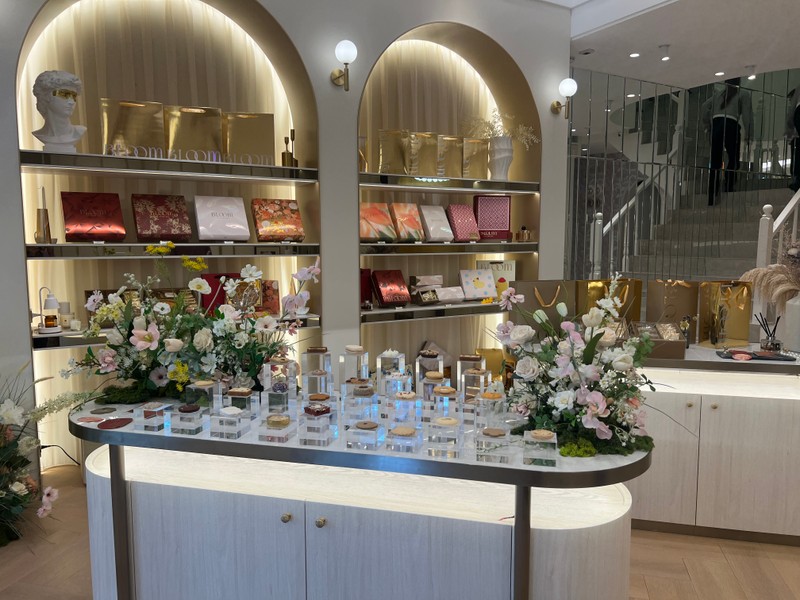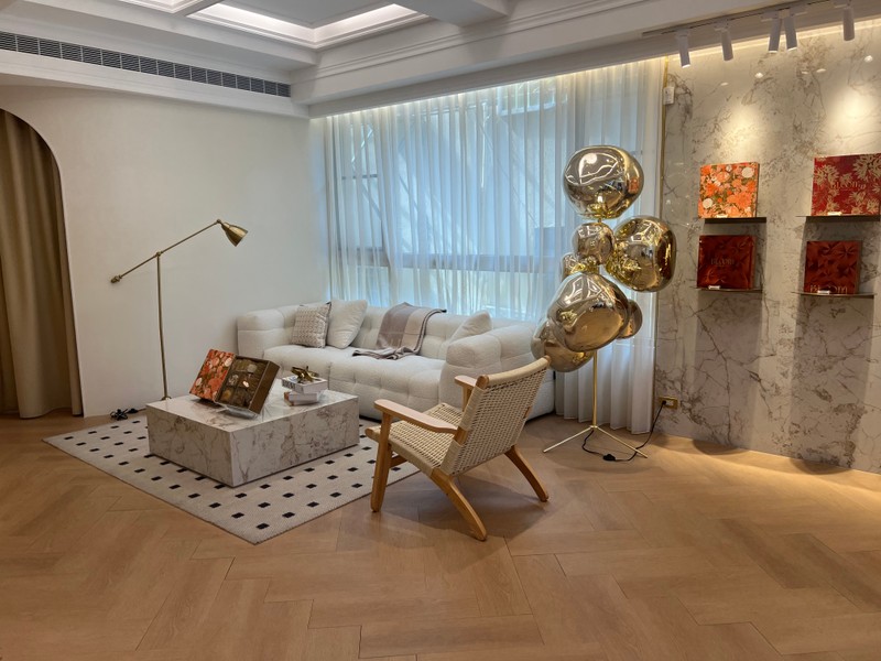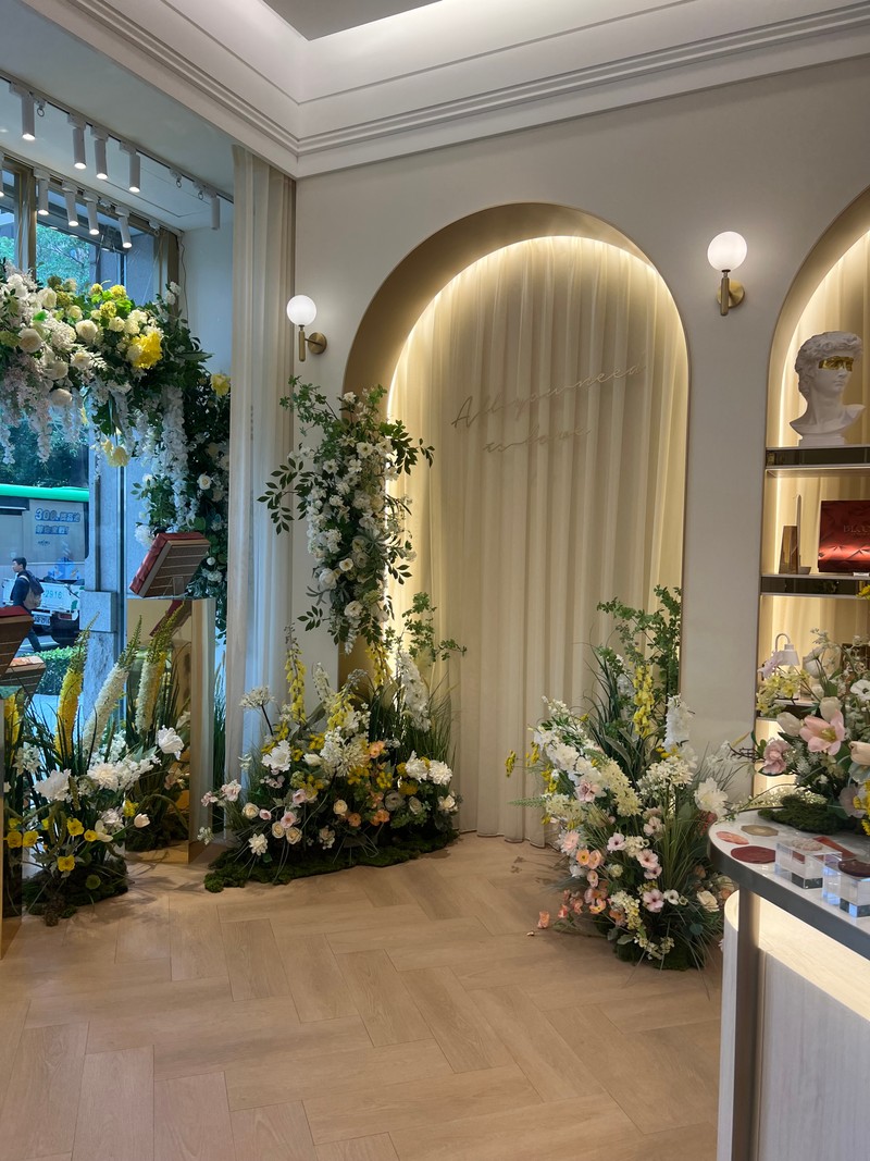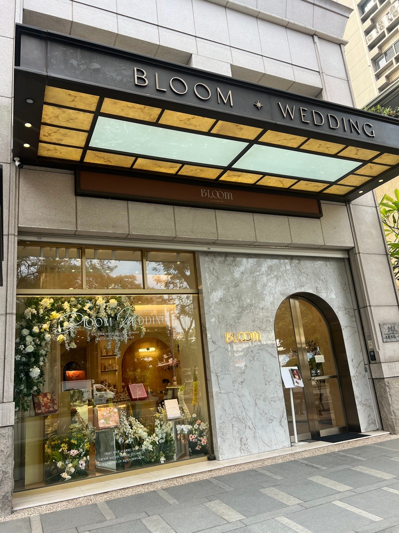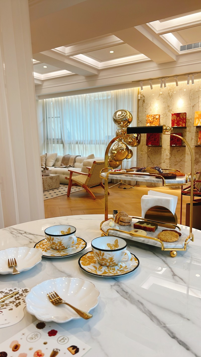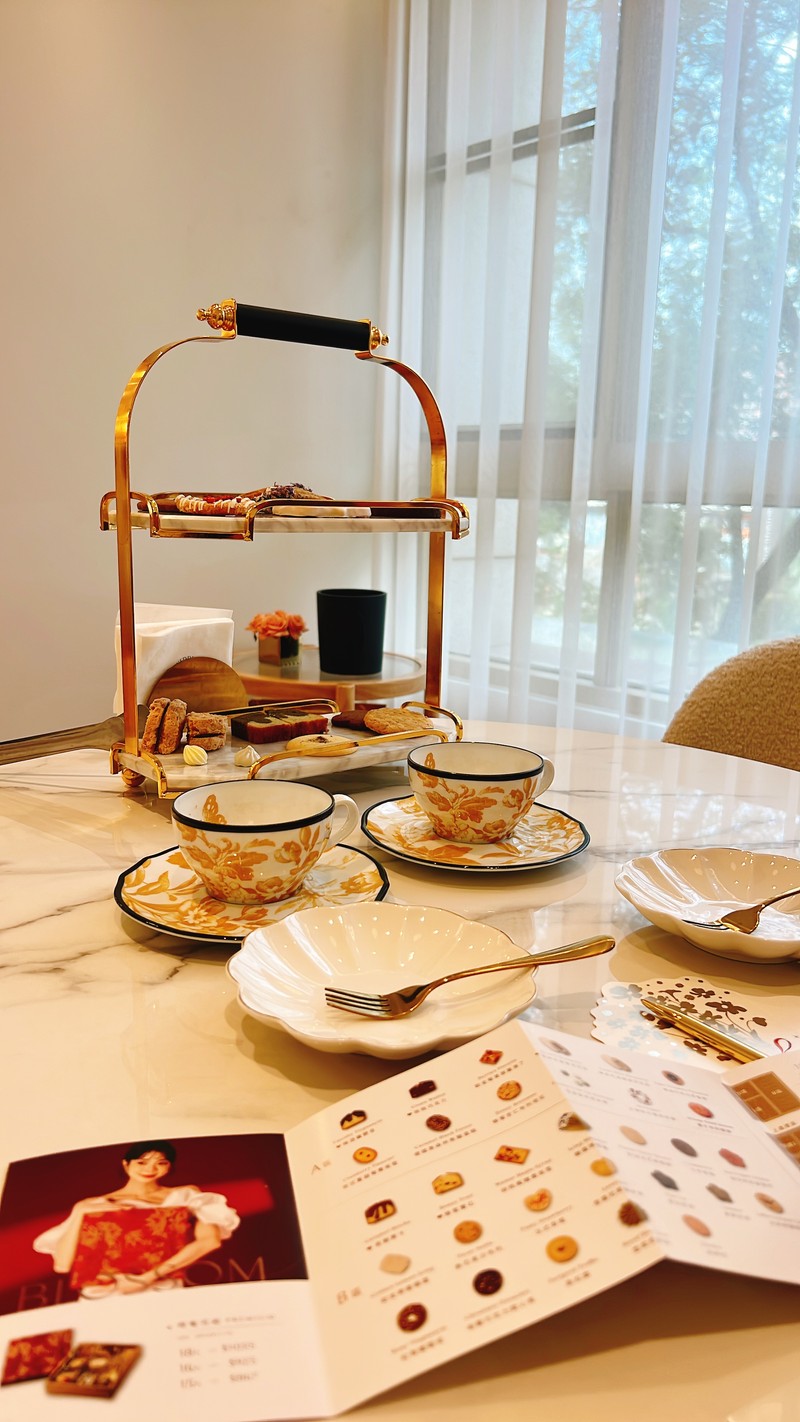 Bloom Wedding 的店面裝潢超級夢幻,就像走進歐洲精緻的沙龍。從門口的鮮花佈置,到內部優雅的大理石桌、金色點綴的層架,每個角落都充滿了質感和儀式感,非常適合新娘們來打卡試吃!我們今天坐的試吃區,光線柔和,搭配那套金黃花紋的精緻茶具,整個下午茶的氛圍感直接拉滿。
