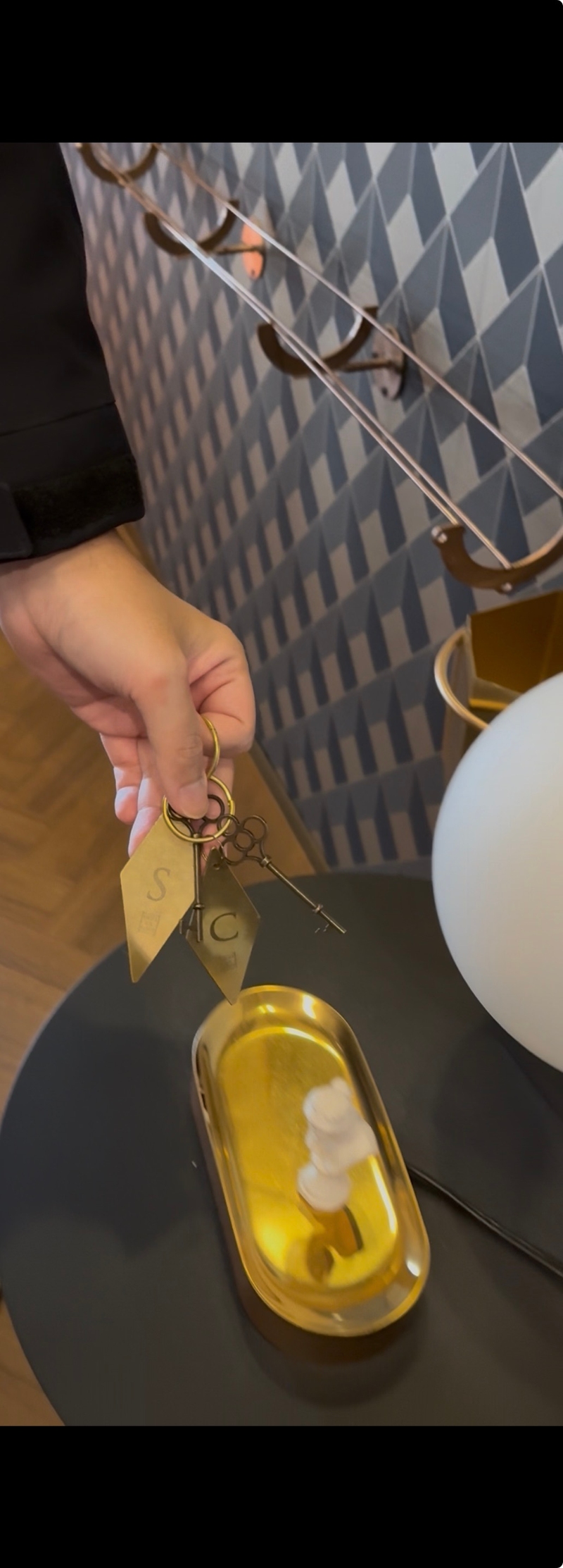 一到櫃檯,就有種要入住飯店的感覺,鑰匙上的英文縮寫分別是我跟另一半姓氏的縮寫,慢慢往樓上走,抵達試吃地點,把鑰匙放在檯面上的小金盤後,燈就亮起,跟飯店插上房卡的模式一樣,滿滿儀式感💕